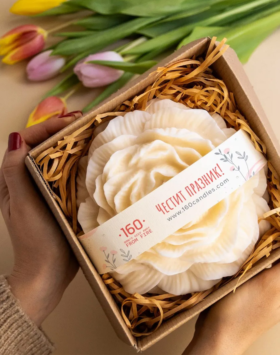 Свещ НАЙ-ГОЛЕМИЯТ БОЖУР за най-любимата жена. Ръчно излята свещ от 100% соев восък и натурални ароматни масла. С мисъл за вас и за природата. Впечатляващият дизайн на големия божур превръща свещта в изискана декорация и перфектен подарък. Тази свещ божур е символ на изящество, романтика и прераждане.