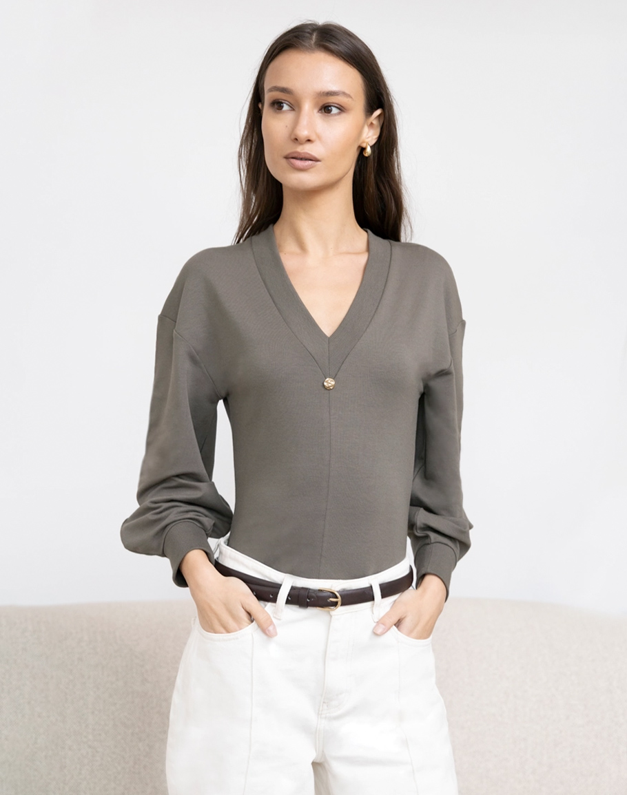 детайли: V-образно деколте, декоративно копче, обемни ръкави