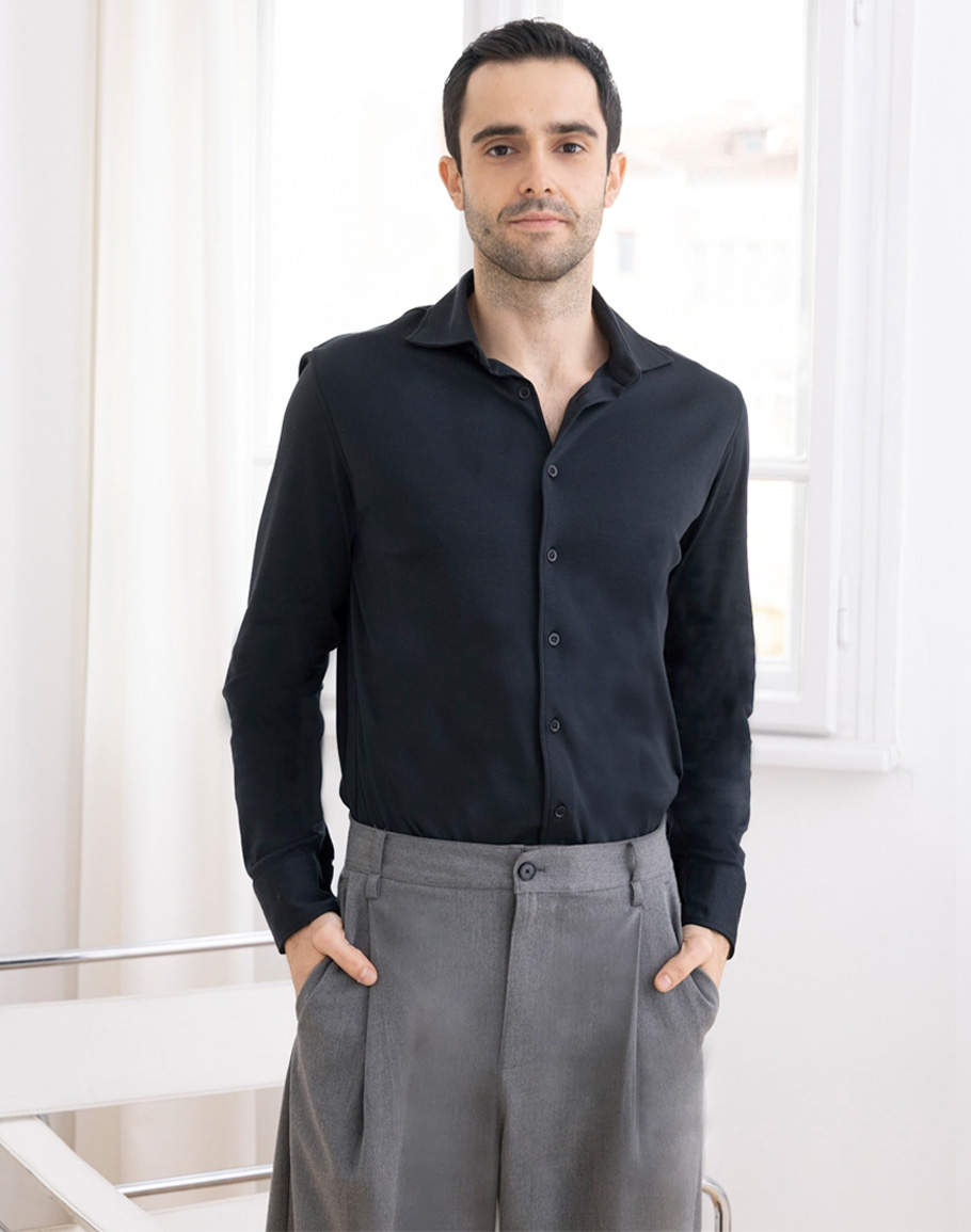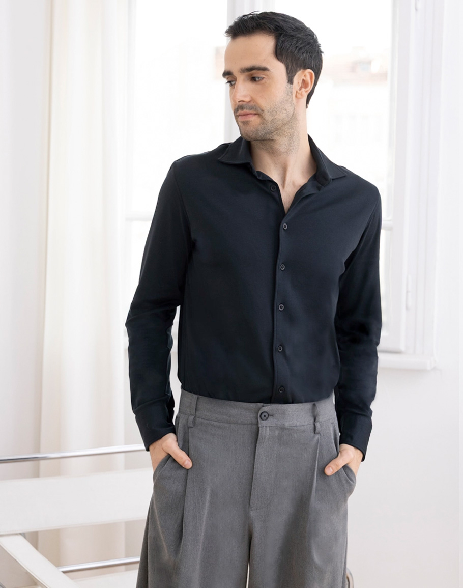 Мъжка трикотажна риза STEVEN BLACK в черен цвят изработена от 100% висококачествен памук интерлок с брилянтен финиш, натурална и дишаща материя. Еластичната материя на тъмносинята мъжка риза гарантира комфорт и свобода при носене. Уникалната разработка на плата съчетава комфорт и стил в едно. Черната риза е перфектна за мъже, които ценят класическата и стилна визия, без да правят компромис с удобството. Трикотажната мъжка риза е нов прочит на елегатното облекло. Отличителен елемент е бродираното лого на гърба. Моделът е с regular силует, с дълъг ръкав, ризарска яка и маншети. Всички елементи допринасят за класическата визия на продукта. Мъжката риза е идеална за различни поводи – от офис облекло до елегантни подови и събития. Мъжката трикотажна черна риза се предлага в размери S, M, L, XL и 2XL.