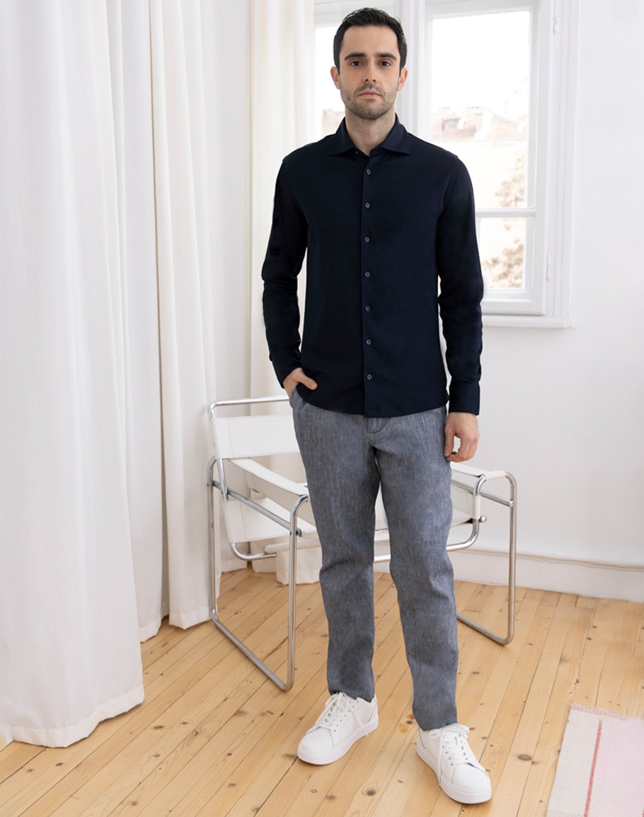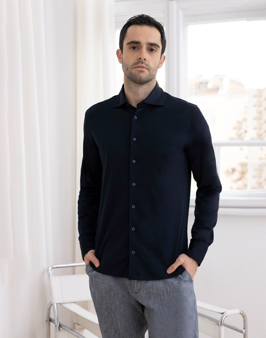 Мъжка трикотажна риза STEVEN NAVY в тъмносин цвят изработена от 100% висококачествен памук интерлок с брилянтен финиш, натурална и дишаща материя. Еластичната материя на тъмносинята мъжка риза гарантира комфорт и свобода при носене. Уникалната разработка на плата съчетава комфорт и стил в едно. Тъмносинята риза е перфектна за мъже, които ценят класическата и стилна визия, без да правят компромис с удобството. Трикотажната мъжка риза е нов прочит на елегатното облекло. Отличителен елемент е бродираното лого на гърба. Моделът е с regular силует, с дълъг ръкав, ризарска яка и маншети. Всички елементи допринасят за класическата визия на продукта. Мъжката риза е идеална за различни поводи – от офис облекло до елегантни подови и събития. Мъжката трикотажна тъмносиня риза се предлага в размери S, M, L, XL и 2XL.