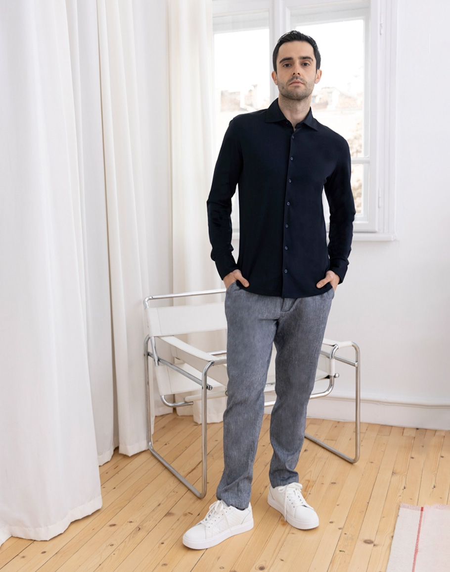 Дизайнерска риза на българския бранд NOLLÍ. NOLLÍ е марка вдъхновена от устойчивата мода, създадена с внимание към детайла. Продуктите на марката са фокусирани към висок клас естествени материи, като за тях ключов елемент в дизайна е комфорта. Произвеждат продуктите им в семейната им компания с 30 годишен опит. Мисията на марка NOLLÍ е да даде нов прочит на любимите Basics. Да създават непреходни дизайни, които са неподвластни на времето. Да разкажат историята на всеки плат и модел, като добавят идентичност, увереност и стил към гардероба ви.