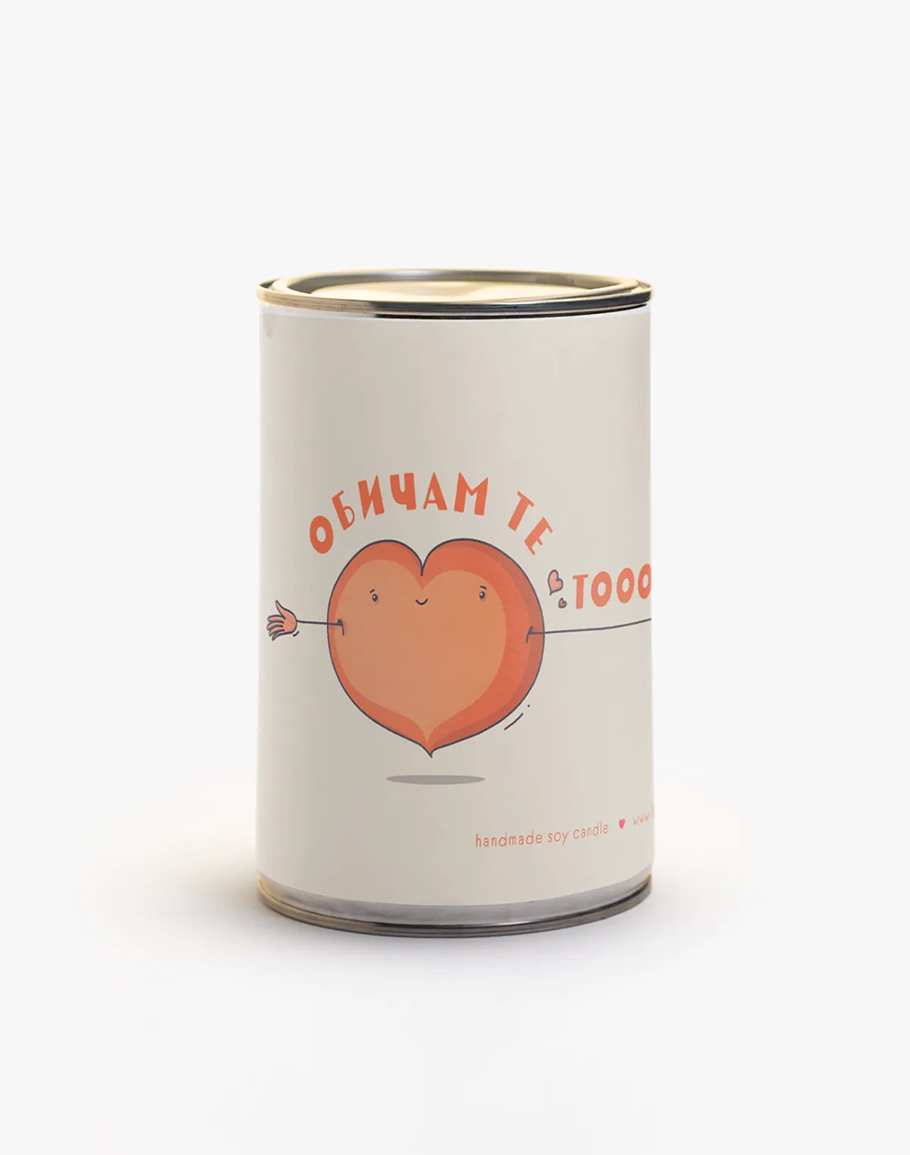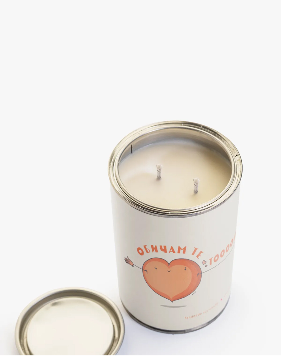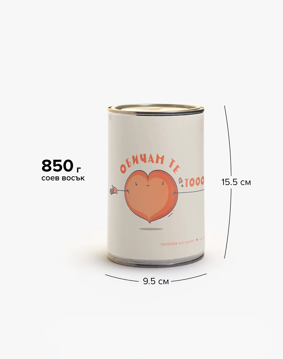 Голяма свещ ОБИЧАМ ТЕ ръчно излята в метална кутия със соев восък и натурални масла. Близо 1 кг восък и цели 160 часа празнично настроение и аромат на цветна градина и... любов. В много лимитирано количество! Соевата свещ изпълва с аромат на свежестта на ябълка в завладяваща комбинация с топлия аромат на дърво. Красив цветен аромат с нежни нотки на сладост. Голяма свещ ОБИЧАМ ТЕ е чудесен избор за подарък за скъпите ви хора.