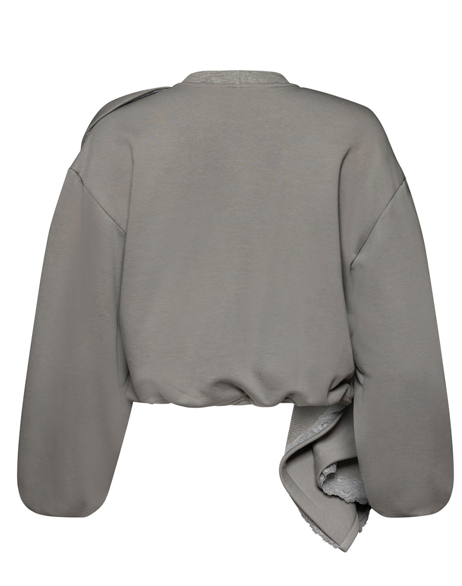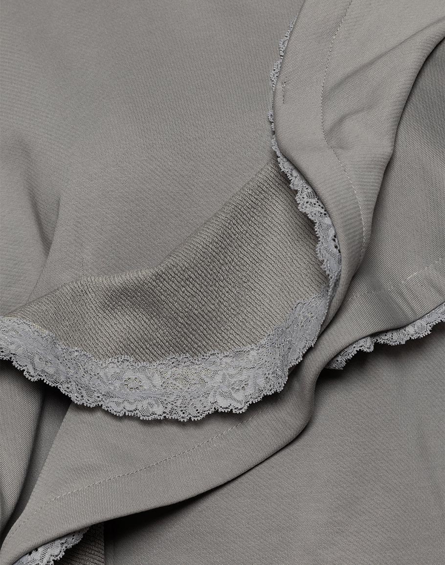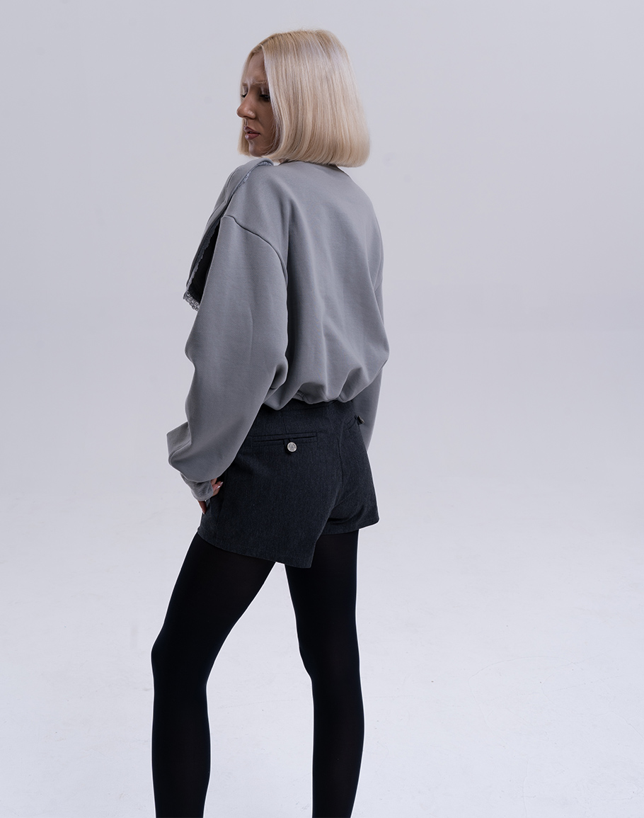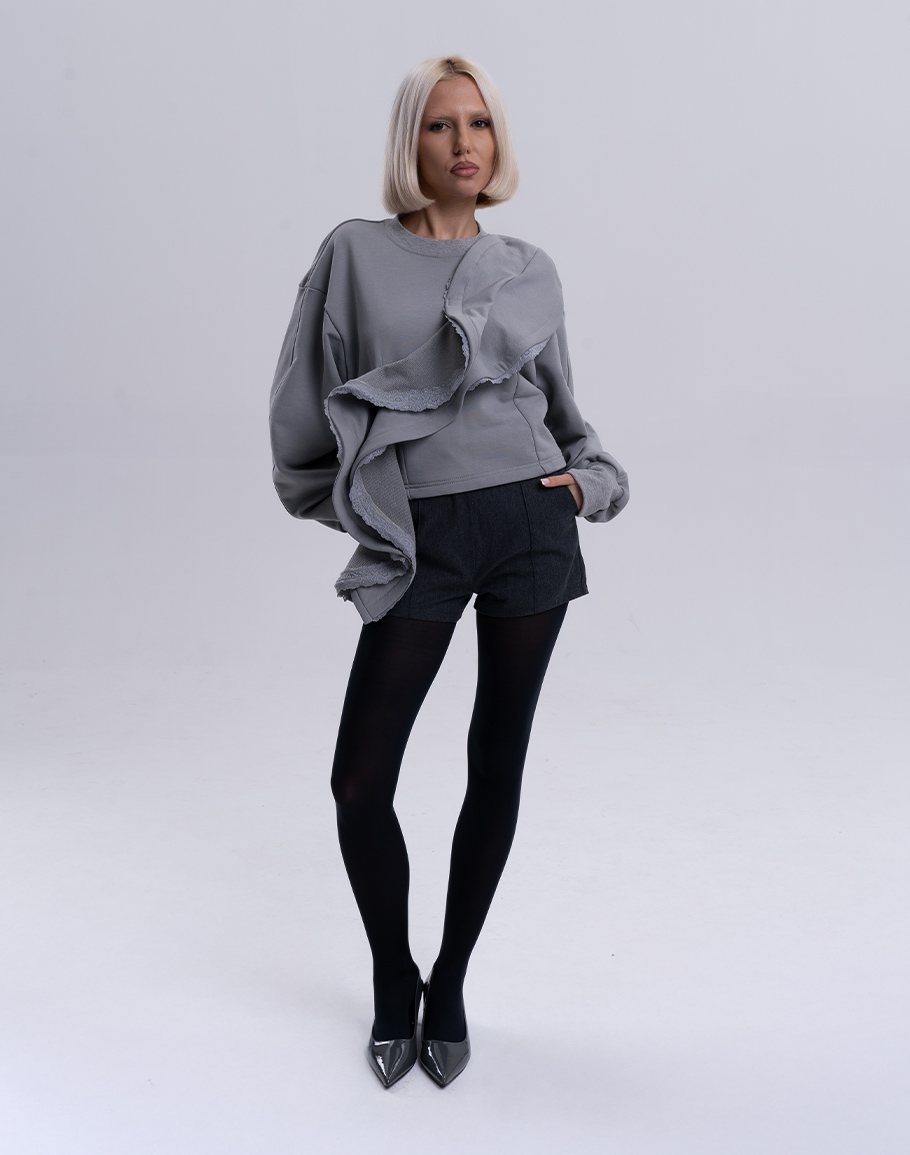 Худи SAYVA в сив цвят конструирано от 100% диагонална памучна вата. Сивото худи е с вталена предна част и оувърсайз задна част. Моделът е с рипс в задната част за обем, прикачена нежна дантела и елемент къдри, емблематични за марката. Уникалният дизайн комбинира комфорт и модерен стил, превръщайки худито в перфектен избор за ежедневни визии с характер и индивидуалност. За цялостна KESEI визия съчетайте с останалите продукти на марката. Дамското сиво худи се предлага в размери S/M и M/L.