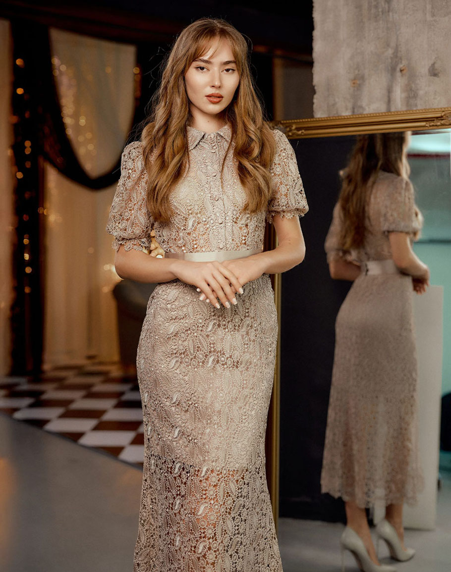 Рокля AURORA в нежен бежов цвят е създадена за жени, които излъчват нежност и самоувереност. Силуетът на елегантната бежова рокля обгръща фигурата с изискана дантела, оформяйки неповторима комбинация от класика и модерна естетика. Фините детайли – романтичната яка и ефирните ръкави – подчертават изкуството на изработка, което е в основата на бранда Famme. Идеална за специални моменти, бежовата дантелена рокля разказва история за елегантност и стил, без да казва нито дума. Съчетайте я с блестящи аксесоари и усмивка – защото тази рокля заслужава да бъде видяна. Дамската бежова дантелена рокля се предлага в размери S, M, L и XL.