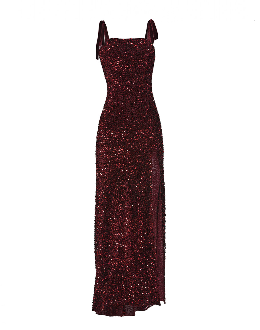 детайли: дълга дължина, пайети, кройка русалка, висока цепка, презрамки панделки