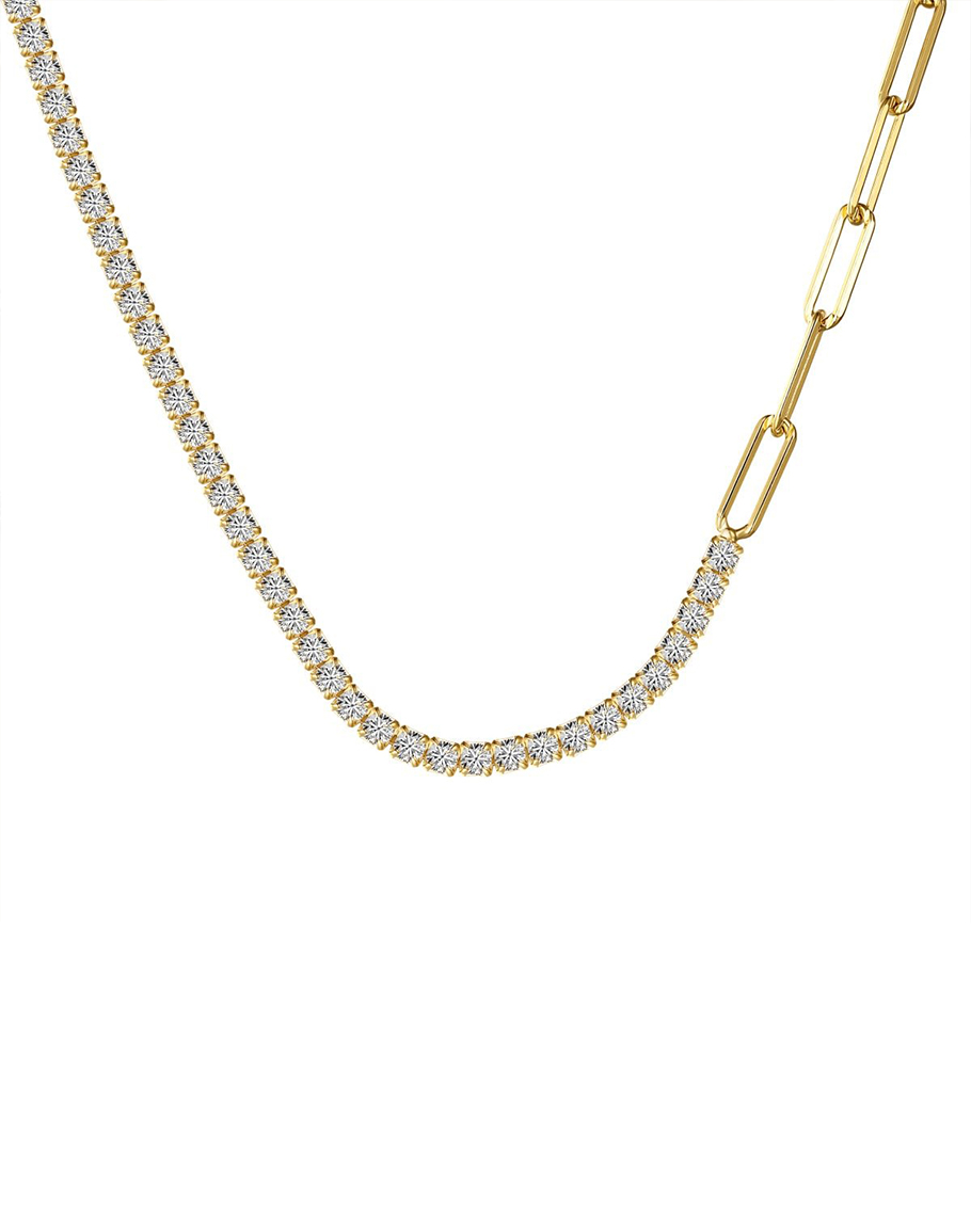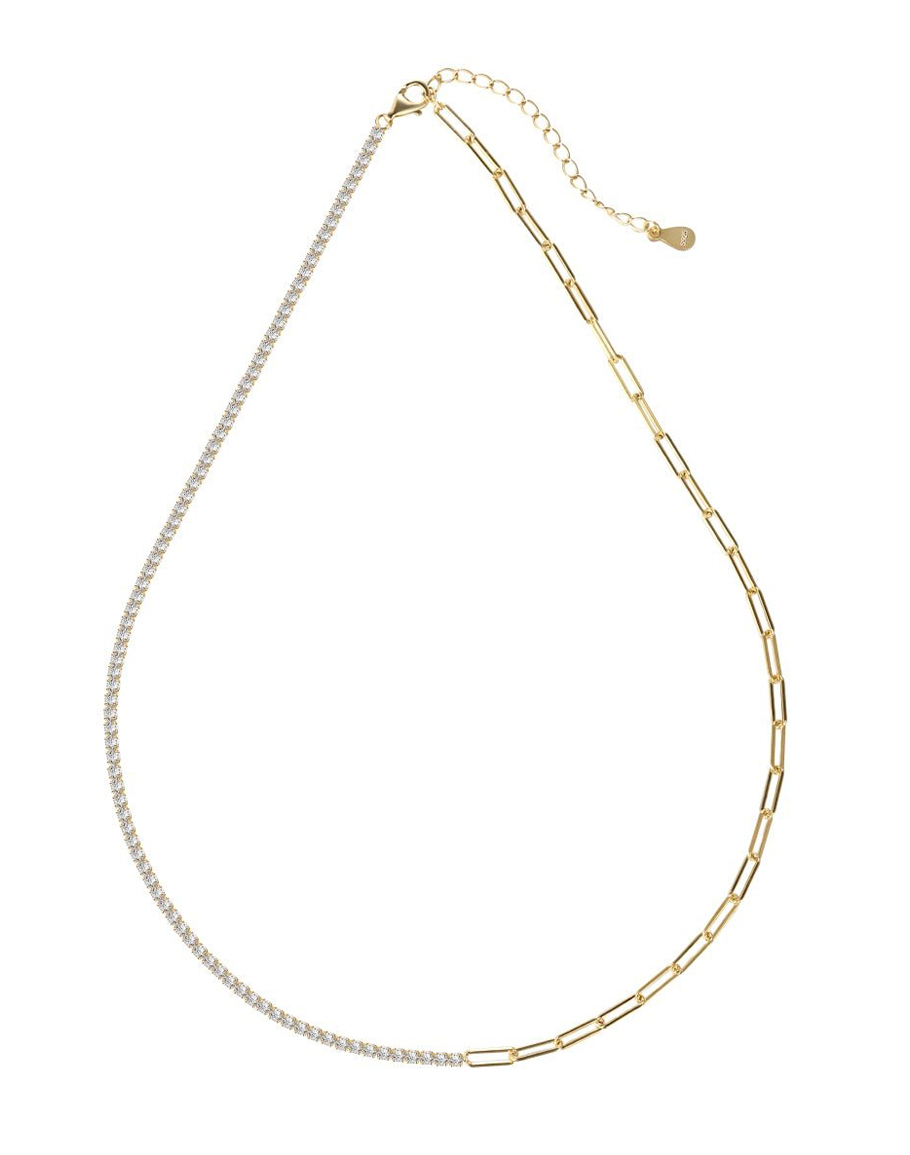 Колие ASPAN 18K GOLD PLATED е изработено от стерлингово сребро 925 и се отличава с изискан контраст между класически тенис сет с кубичен цирконий и paperclip звена. Балансираният дизайн на златистото колие „половин на половина“ съчетава вечен блясък с модерно, архитектурно усещане, което го прави универсално и впечатляващо бижу. Елегантно, но същевременно съвременно, златистото колие се съчетава перфектно с гривна ASPEN PAPERCLIP. Златистото колие е перфектен избор за подарък за вас или за скъпа ваша дама.