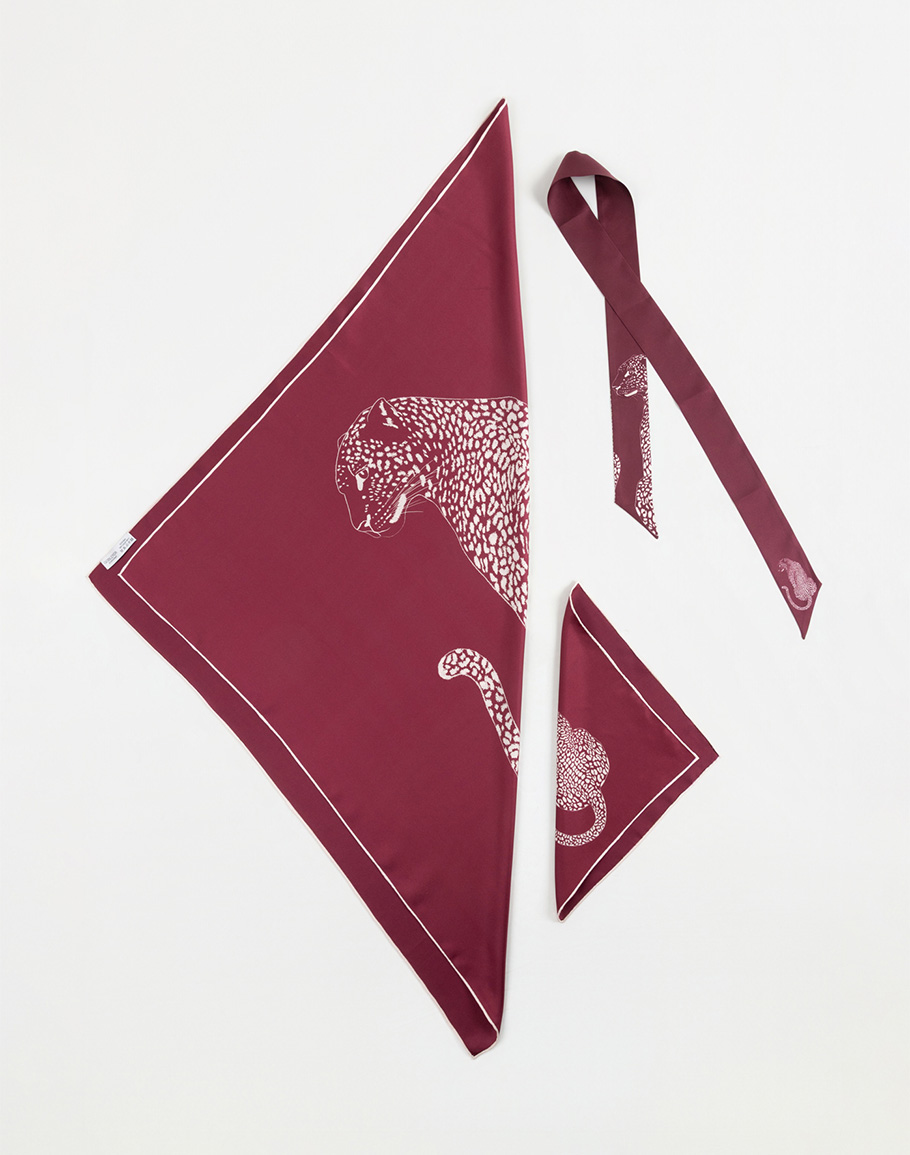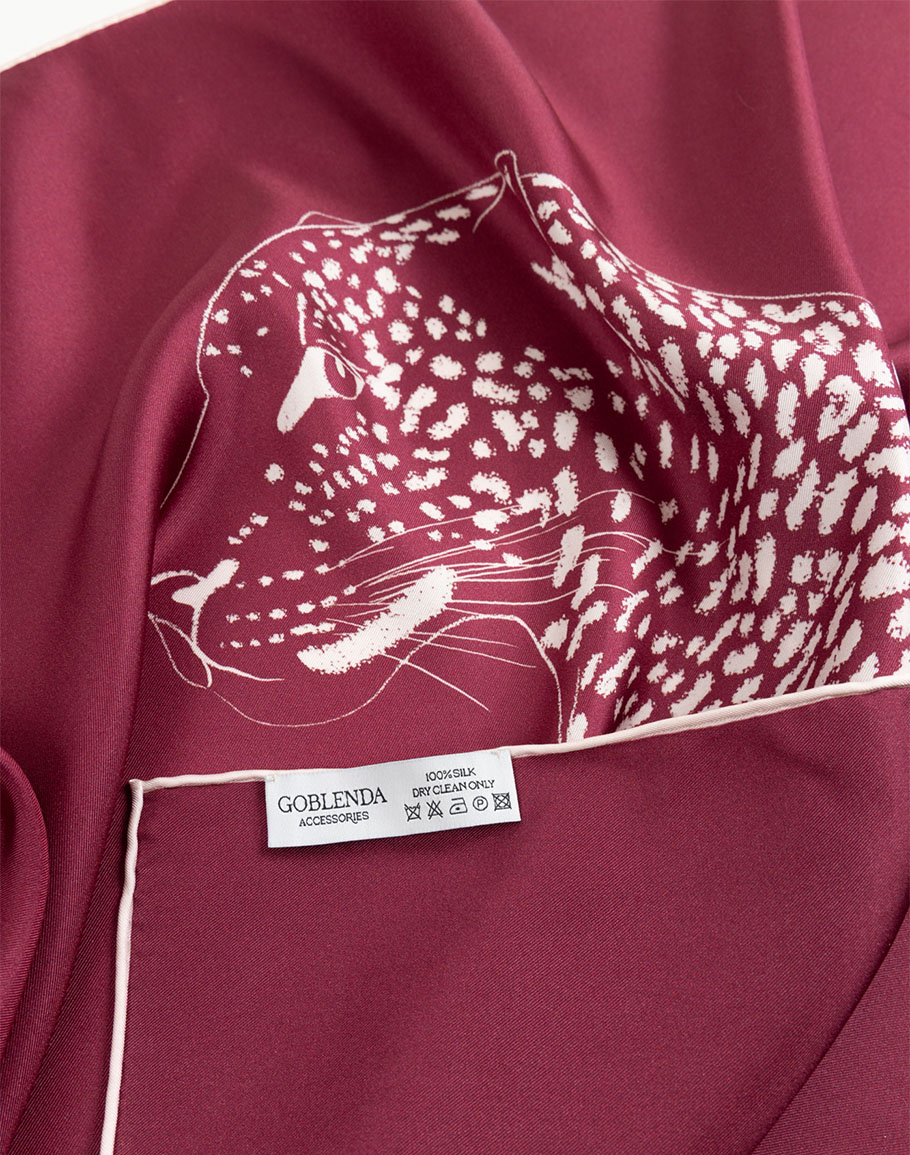 Копринено кърпичка SABRINA създадена от 100% висококачествена коприна Mulberry Silk, е изключителен аксесоар, който съчетава лукс и функционалност в компактен размер. Копринената кърпичка е с леопардов мотив – изтънчено, но дръзко, точно като Сабрина, която се връща от Париж като нова жена. Копринено бордо фишу за онези, които вярват, че истинската трансформация идва отвътре. С размери 30×30 см, кърпичката е двустранно печатана с ръчен подгъв и е част от лимитирана серия от 150 бр., предоставяйки усещане за уникалност и изисканост. С подходящ размер за мъжка кърпичка за костюм, този аксесоар внася фин завършек към официални визии. За дамите, копринената кърпичка е идеална като стилен акцент, допълващ облеклото, увита около китката, или прикрепена към чанта или колан. Всеки модел от колекцията притежава сертификат за автентичност, което добавя колекционерска стойност и превръща този аксесоар в безценен подарък или лично допълнение към гардероба. Копринената кърпичка на точки е чудесен избор за подарък както за мъже, така и за жени.