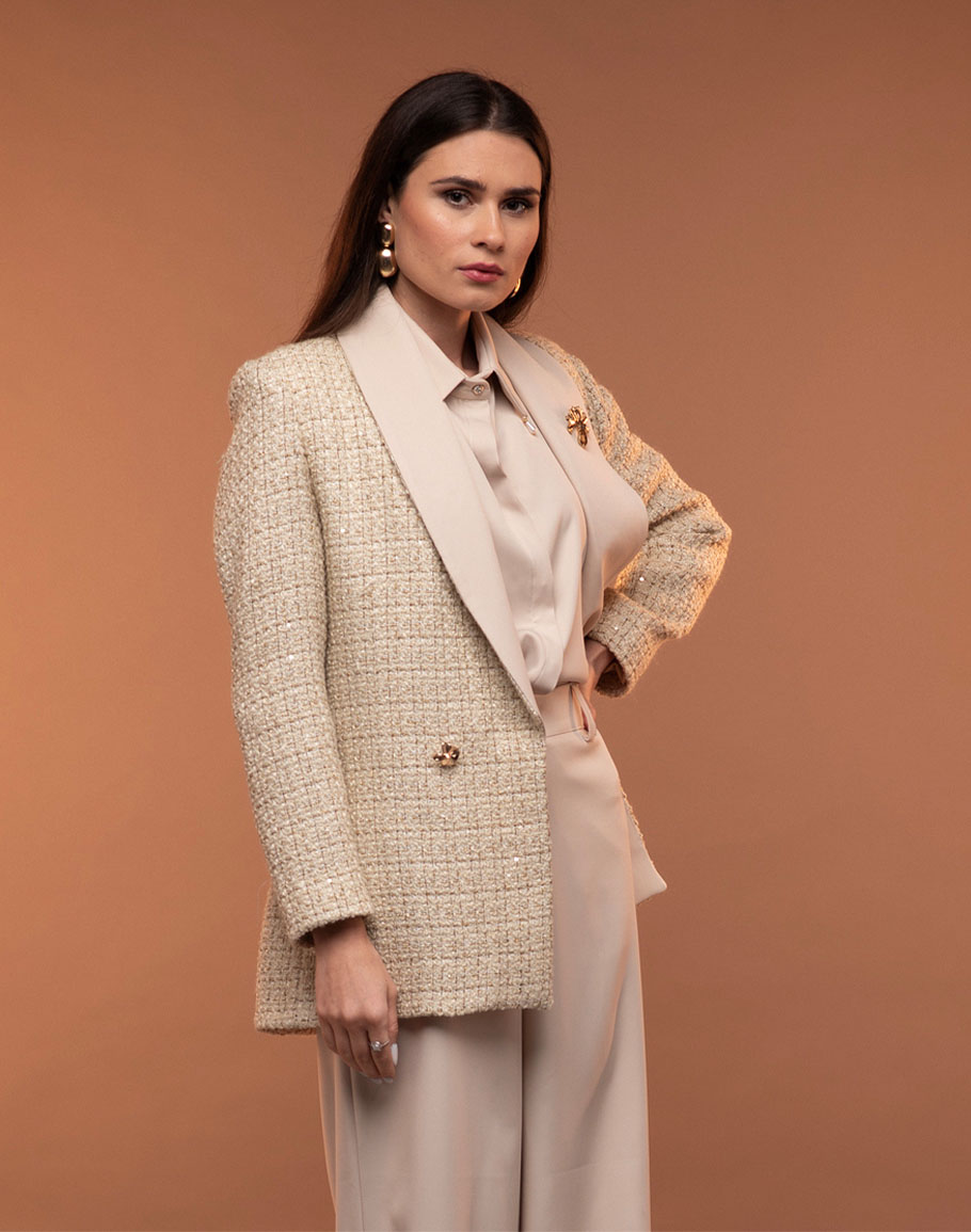 Костюм DIANA BEIGE от меко бежово букле е изискано съчетание между комфорт, стил и френска естетика. Сакото от бежовия костюм впечатлява с нежната си текстура и прецизна линия, която оформя красив и женствен силует, без да бъде прекалено строга. Правият панталон издължава фигурата и създава усещане за лекота и баланс, подчертавайки елегантната стойка. Луксозният вид на буклето придава класа и финес, а актуалният бежов цвят носи мекота и съвременна свежест. Бежовият костюм е лесен за комбиниране с различни топове, ризи и аксесоари, този костюм е универсален избор както за специални поводи, така и за стилно ежедневие с безупречен, френски почерк. Дамските бежов костюм се предлага в размер XS-M.