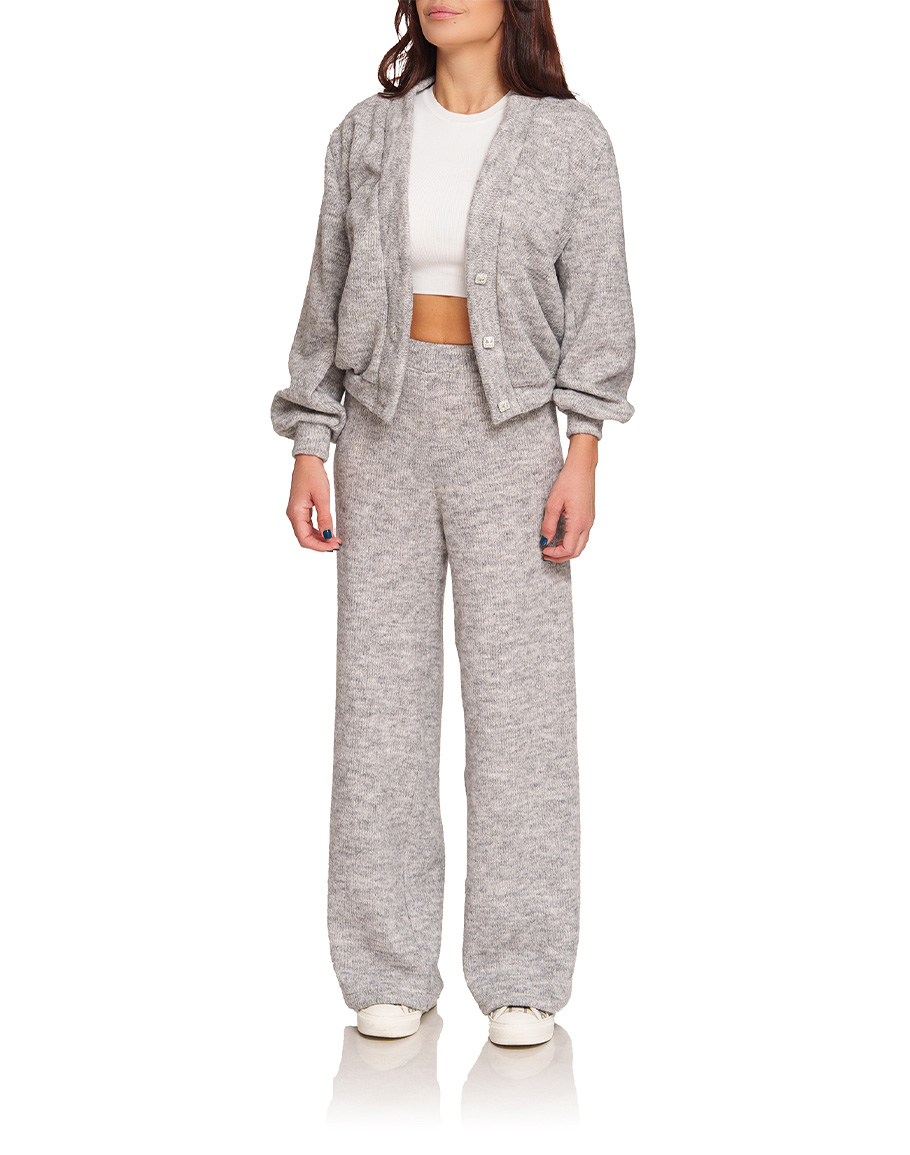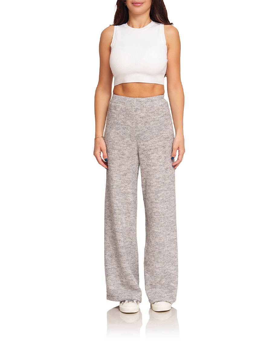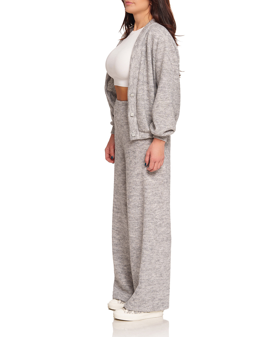 Панталон ELLIE в стилен сив цвят изработен от меко плетиво, което осигурява комфорт и свобода на движение. Сивият панталон е с висока талия и удобен ластик, подчертаващ силуета, а разкроеният крачол придава модерна и елегантна линия. Подходящ както за ежедневието, така и за по-небрежно елегантна визия, този панталон лесно се съчетава с плетени жилетки, пуловери или спортни горнища за завършен и стилен тоалет. За визията от снимките комбинирайте с жилетка LEXIE. Дамският сив разкроен панталон се предлага в размери XS/S и M/L.