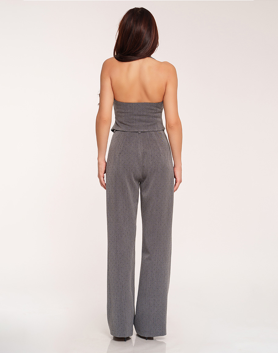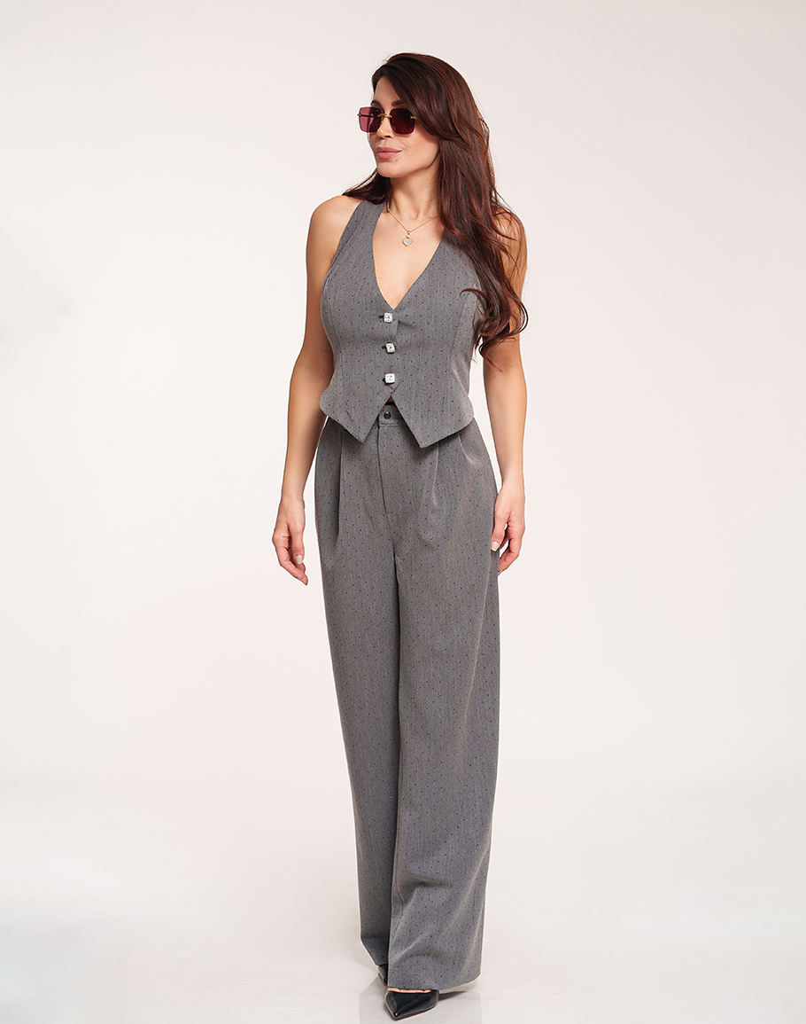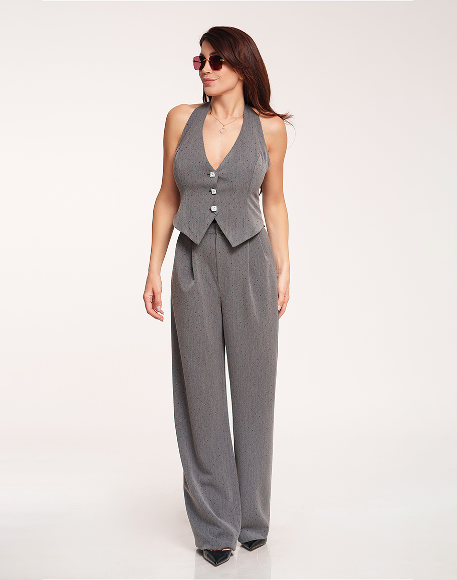Панталон RAIA в сив цвят изработен от памук, покрит със стотици кристали, които отразяват по най-красивия начин светлината и придават блясък на вашия специален повод. Сивият панталон е с класическа елегантна кройка, висока талия и басти, които оформят силуета. Широкият крачол осигурява свобода на движението и комфорт, като придава изискано и модерно излъчване. Сивият широк панталон е подходящ както за официални поводи, така и за стилна ежедневна визия. За монохромна визия съчетайте с елек DARIA. Дамският сив елек с кристали се предлага в размери XS, S и M.