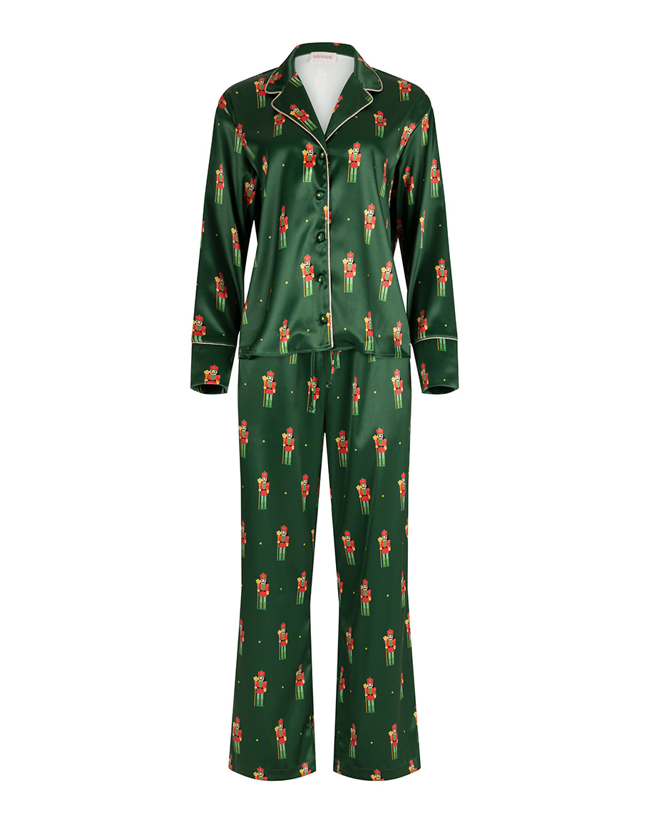 Пижамен сет ЛЕШНИКОТРОШАЧКАТА в красив зелен цвят конструиран от фина сатенена материя със свободна, удобна кройка. Празничният зелен пижамен сет е изработен с внимание към детайла и е с авторски принт Лешникотрошачката, създаден да внесе настроение и коледна магия. Ризата на пижамения сет е със златист кант по ръбовете и стилни копчета, които придават изтънчен завършек. Панталонът е лек и комфортен със свободна кройка. Материята на зеления пижамен сет е нежна и подходяща както за уютни вечери у дома, така и за празнични моменти. Пижамен сет ЛЕШНИКОТРОШАЧКАТА е идеален избор за подарък или за създаване на собствен коледен ритуал в типичния MIRAME стил – мек, бляскав и празничен. Дамският зелен сет ЛЕШНИКОТРОШАЧКАТА се предлага в размери XS/S и M/L.