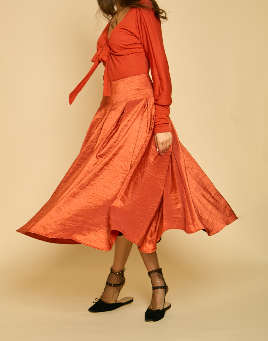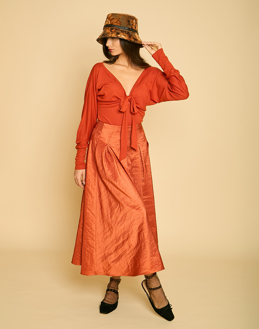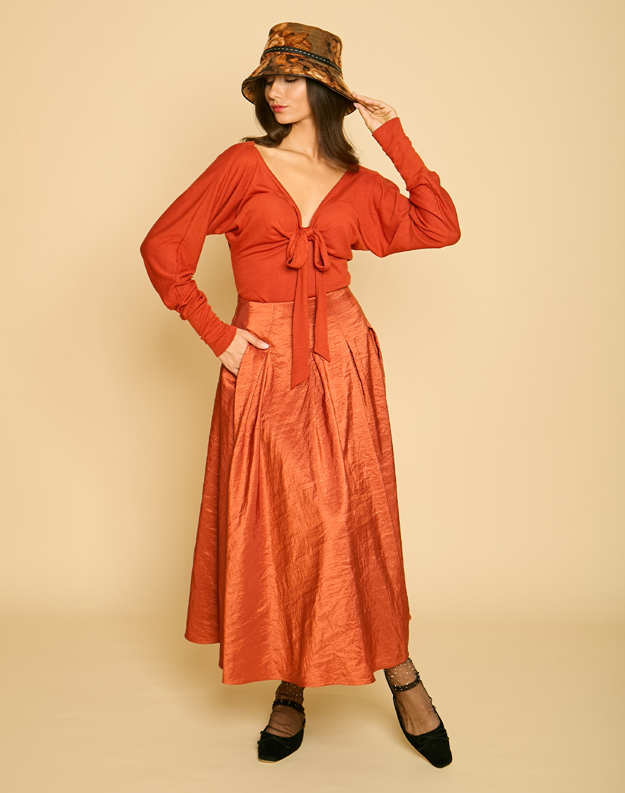 Пола MELANI BRICK в цвят керемида прецизно моделирана както за комфорт, така и за стил. Бежовата керемидена пола е с басти в областта на талията и странични джобове в шев. Закопчава се с цип на гърба. Полата е изработена е от висококачествена материя, която запазва формата си и осигурява приятно усещане при носене. Подходяща е както за ежедневието, така и за по-специални поводи — полата се комбинира чудесно както с риза и токчета, така и с елегантен топ и сандали. Миди полата придава женственост и фин завършек на всяка визия. Дамската миди керемидена пола се предлага в размери S, M и L.