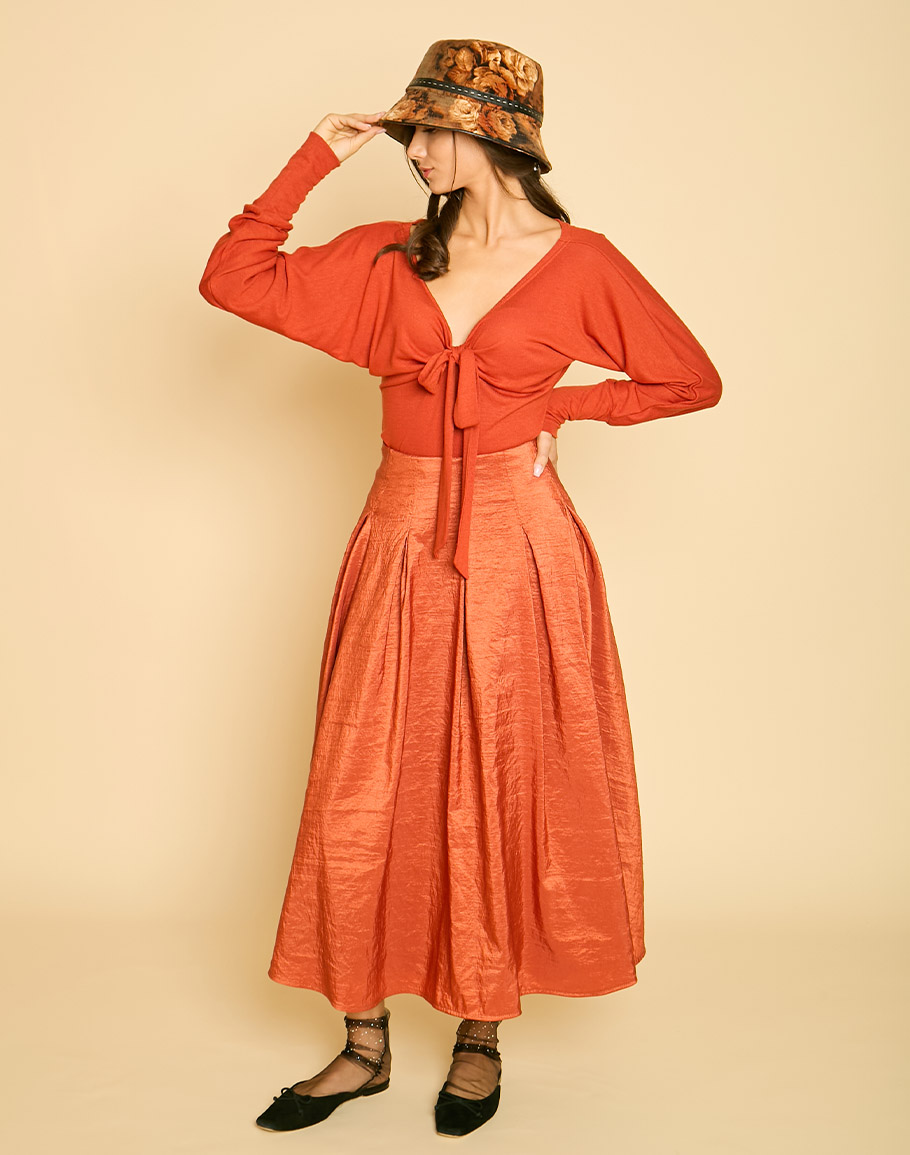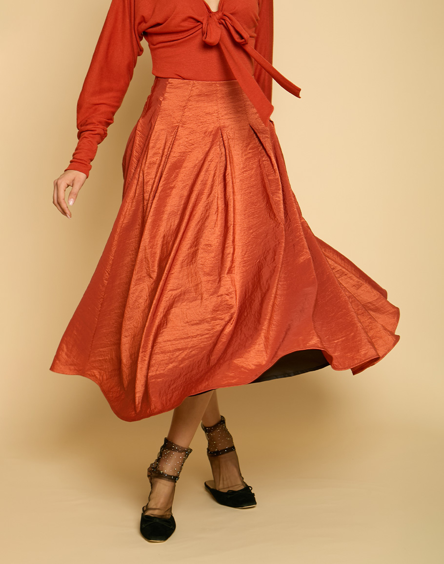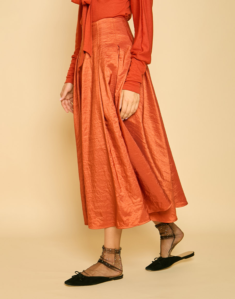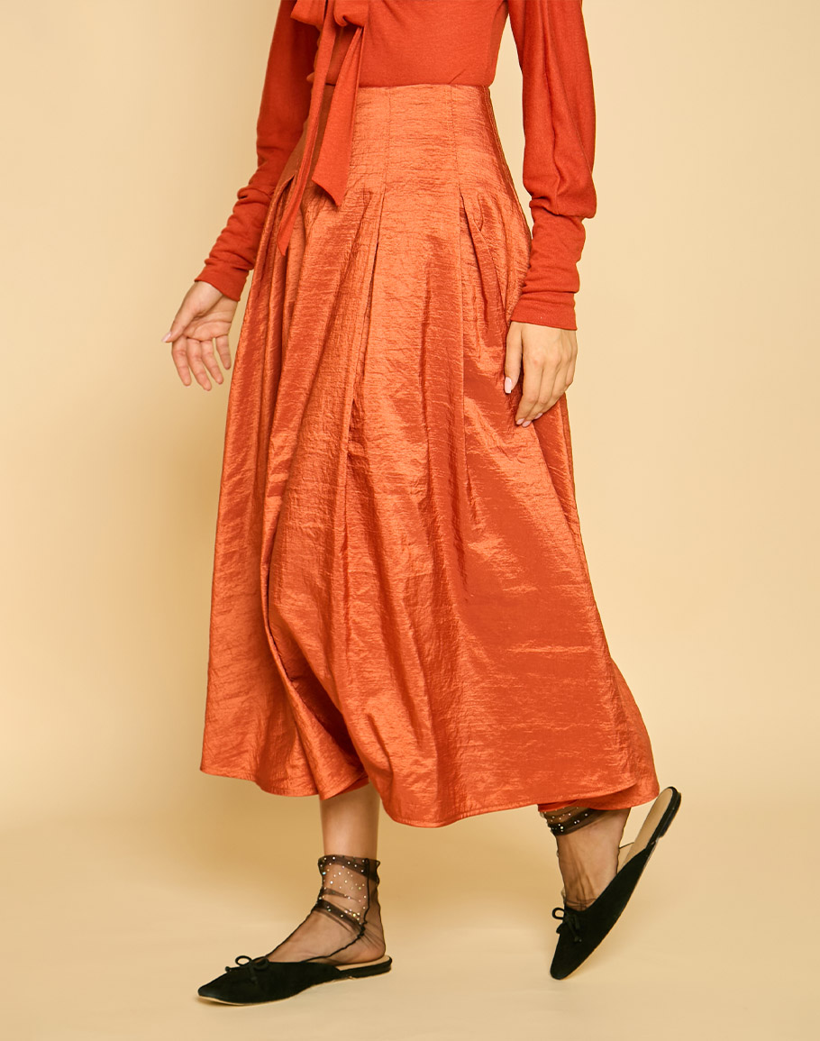 Пола MELANI BRICK в цвят керемида прецизно моделирана както за комфорт, така и за стил. Бежовата керемидена пола е с басти в областта на талията и странични джобове в шев. Закопчава се с цип на гърба. Полата е изработена е от висококачествена материя, която запазва формата си и осигурява приятно усещане при носене. Подходяща е както за ежедневието, така и за по-специални поводи — полата се комбинира чудесно както с риза и токчета, така и с елегантен топ и сандали. Миди полата придава женственост и фин завършек на всяка визия. Дамската миди керемидена пола се предлага в размери S, M и L.