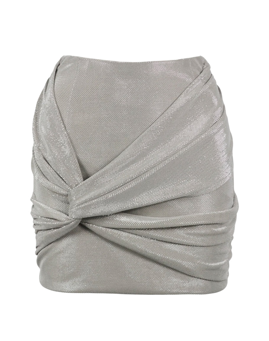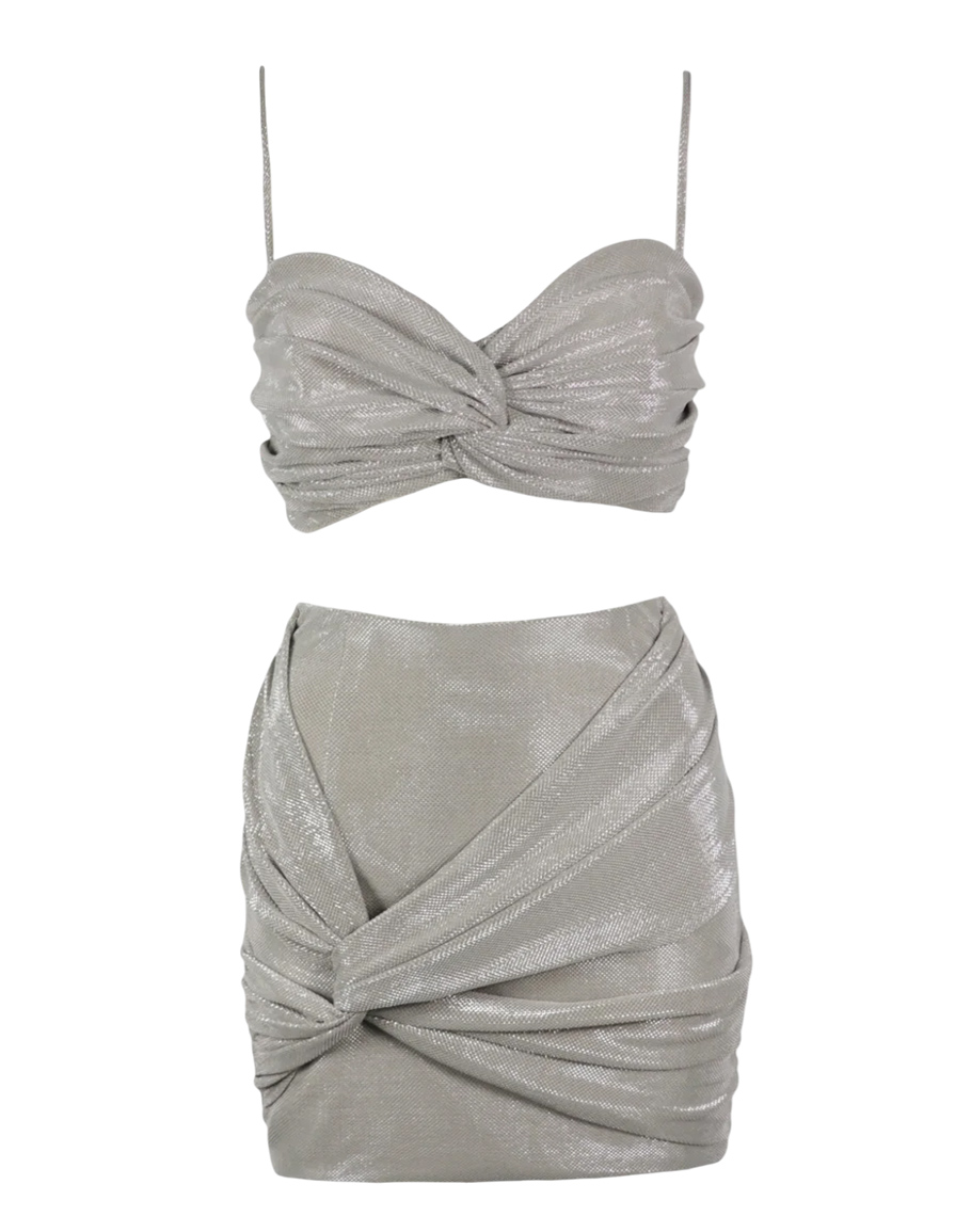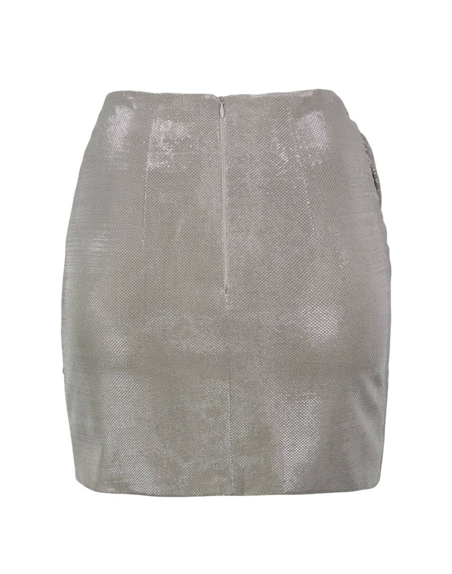 Пола SILVER LIQUID METAL в сребрист цвят изработена стегната еластична материя, която изглажда линията и стои стабилно по тялото. Среристата блестяща пола е създадена за сцена, светлини и увереност. Полата е със силует, който подчертава тялото, драпирани линии и скулптуриращ ефект – модел, който не просто се носи, а се показва. Моделът е с драпирана конструкция за силно изразена линия, еластична материя, която оформя и пристяга, както и с бляскава текстура, която улавя светлината. Сребристата мини пола е с удобна висока талия за издължена фигура. Полата е перфектна за вечерни излизания, партита, клубове и специални моменти. Комбинирайте с бюстието от същата серия за монохромна визия или с черно боди за изчистен лукс. Дамската къса сребриста блестяща пола се предлага в размери XS, S и M.