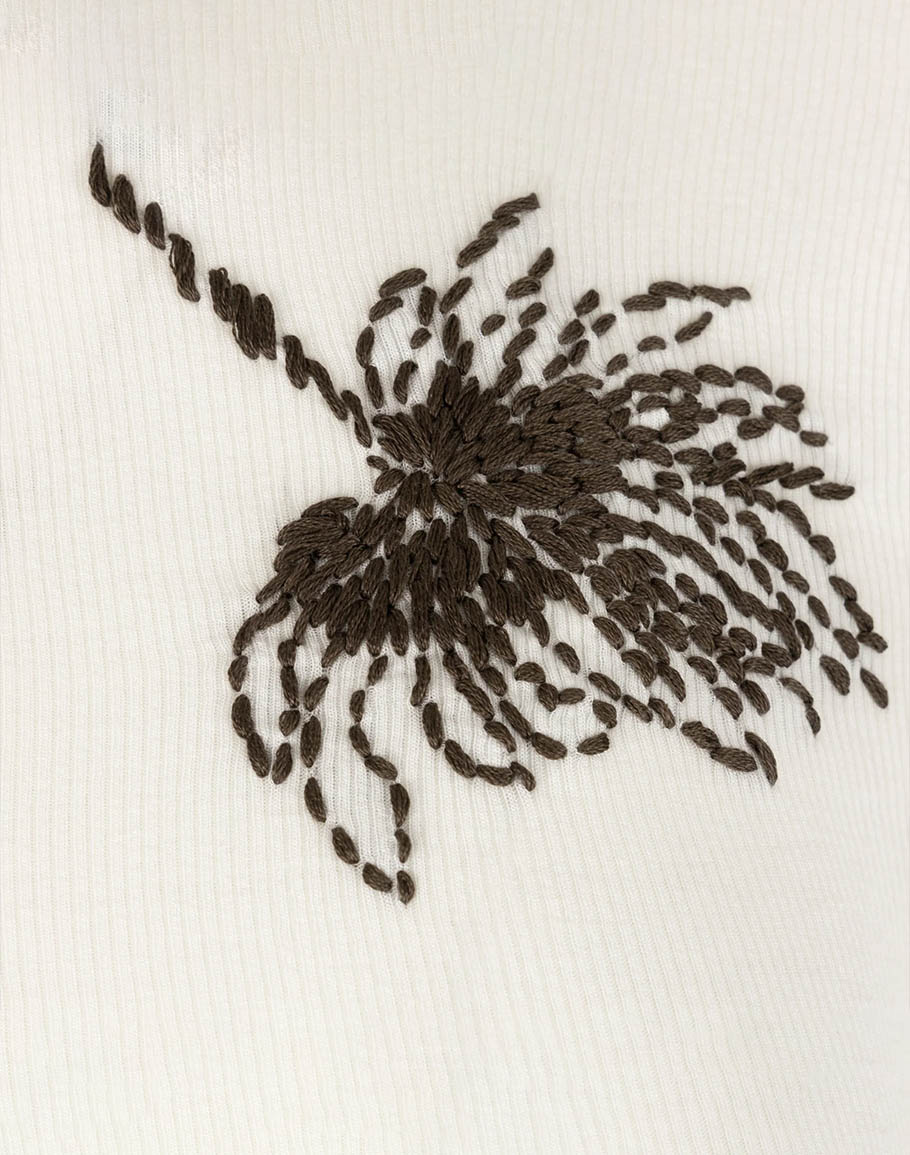 Пуловер с поло KIM изработен от кашмирена смесена материя с нежен крем цвят. Кашмиреният пуловер със своите супер фини влакна, създава изключително меко усещане и висока способност за задържане на топлина. Ръчно изработената флорална бродерия положена върху пуловера го прави наистина запомнящ се. Съчетайте с панталон/дънки или с елегантна пола. Дамският кремав кашмирен пуловер с поло се предлага в размери XS, S, M, L и XL.