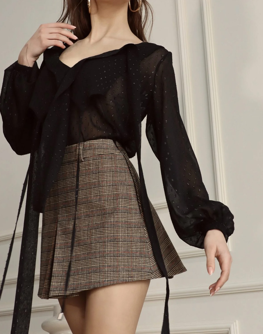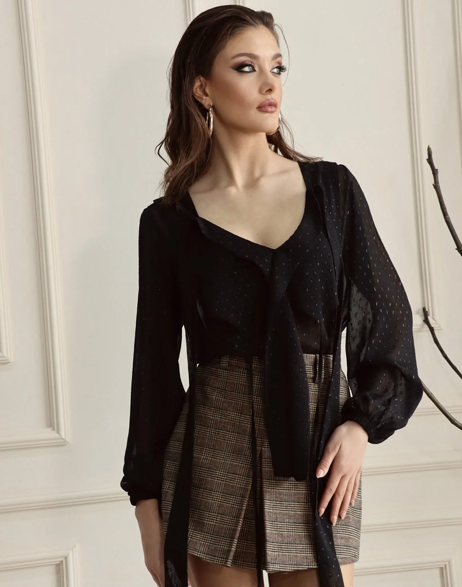 Риза BLACK CHIFFON в черен цвят изработена от 100% шифон. Черната риза е с елегантни буфан ръкави създаващи една кокетна визия, ефирна прозрачност, V-образно деколте и ленти, които може да носите свободно или да ги завържете. Ризата е перфектен избор за ежедневни и вечерни моменти. За една перфектна MIJEL визия комбинирайте с другите модели на марката. Дамската черна риза с буфан ръкави се предлага в размери XS/S и M/L.