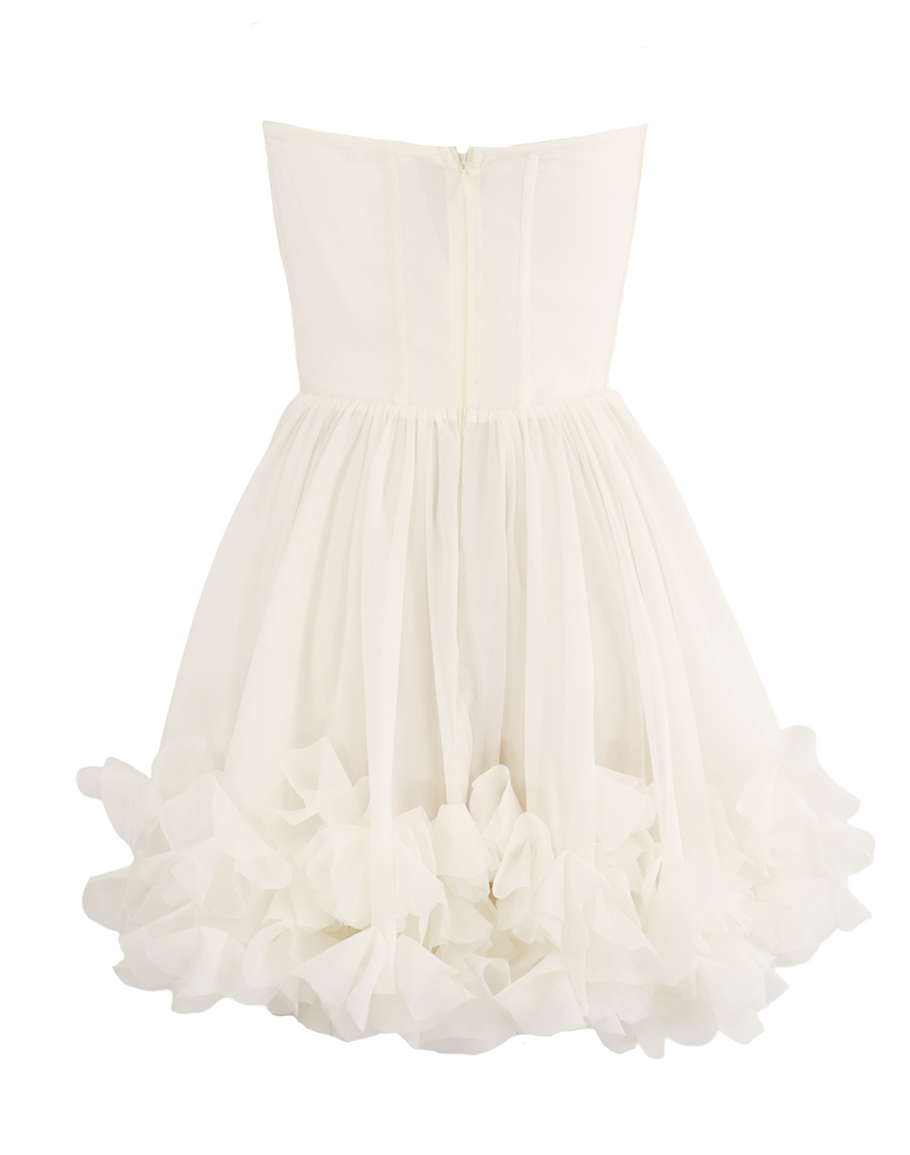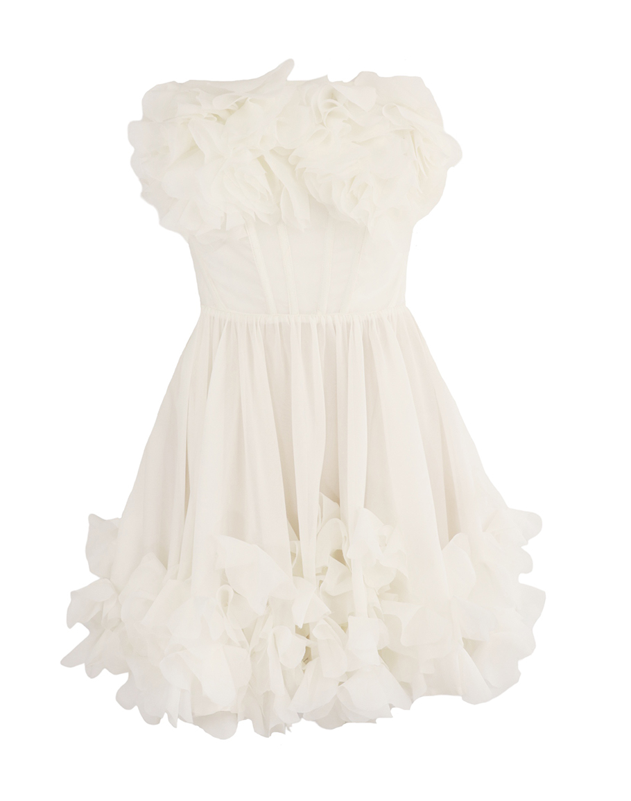 Рокля CLOUD COUTURE в бял цвят конструирана от полиестер. Бялата рокля е с корсетна горна част и силно разкроена долна. Акцентът на роклята са флорални детайли в деколтето и в долната част. Изключително стилна, красива, елегантна и кокетна, бялата рокля е перфектен избор за специални моменти и коктейлни поводи. Добавете бижута и елегантни токчета. Дамската бяла елегантна къса рокля се предлага в размери XS, S, M и L.