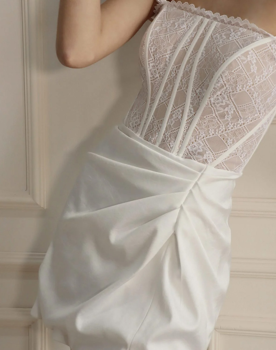 Рокля COUTURE LACE в бял цвят изработена от полиестер. Бялата рокля е с вталена кройка, презрамки създаващи удобство и квадратно деколте. Роклята е с нежна дантелена горна част и с долна от сатен създаващо удобство при движение с цепка. Моделът е чудесен избор за вашите специални моменти. Дамската елегантан бяла къса рокля се предлага в размери XS, S и M.