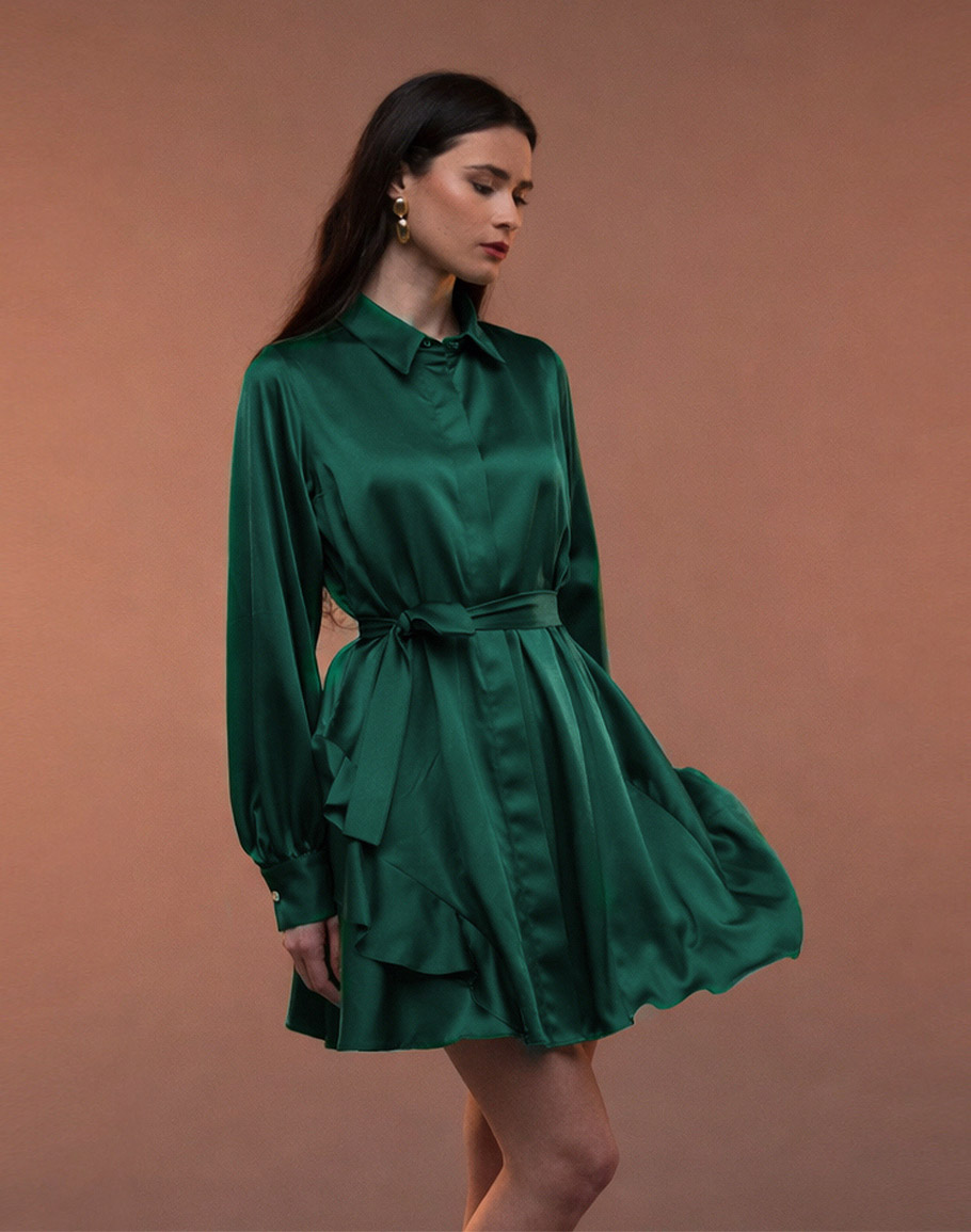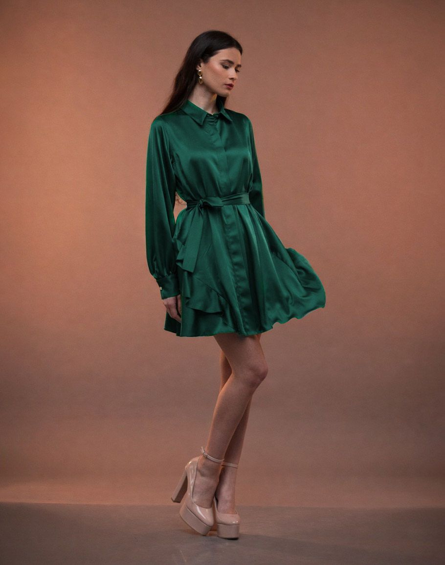 Рокля DINASA VERDE в зелен цвят съчетава романтика и елегантност в изключително нежна визия. Изработена от нежен сатен, зелената къса рокля придава на роклята изтънчен и луксозен блясък. Свободните ръкави на роклята добавят лекота и ефирност, докато разкроената долна част създава красиво движение и форма, подчертавайки женствеността. Роклята е перфектна за ежедневието, като същевременно е достатъчно елегантна за по-специални поводи. Лесно се комбинира с различни аксесоари, от класически обувки до по-смели бижута, в зависимост от настроението и събитието. Зелената къса рокля е универсален и стилен избор, който носи усещане за романтична лекота и изисканост в същото време. Дамската къса зелена сатенена рокля се предлага в размер XS-М.
