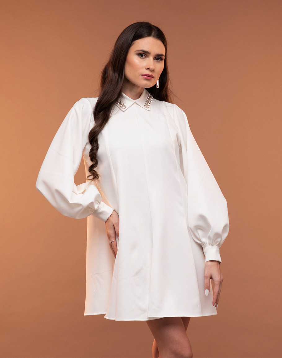 детайли: свободни буфан ръкави, подвижна яка с кристали, къса дължина