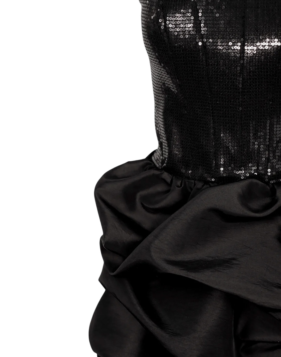 Рокля TAFFETA GLAMOUR в черен цвят изработена от полиестер. Роклята е с дизайн, който е перфектен за вашите специални моменти и поводи. Черната къса рокля е горна пайетна част с голи рамене тип бюстие и долна, която е кокетно оформена с тафта. Добавете бижута и аксесоари за финален завършек на визията. Дамската елегантна черна рокля се предлага в размери XS, S и M.
