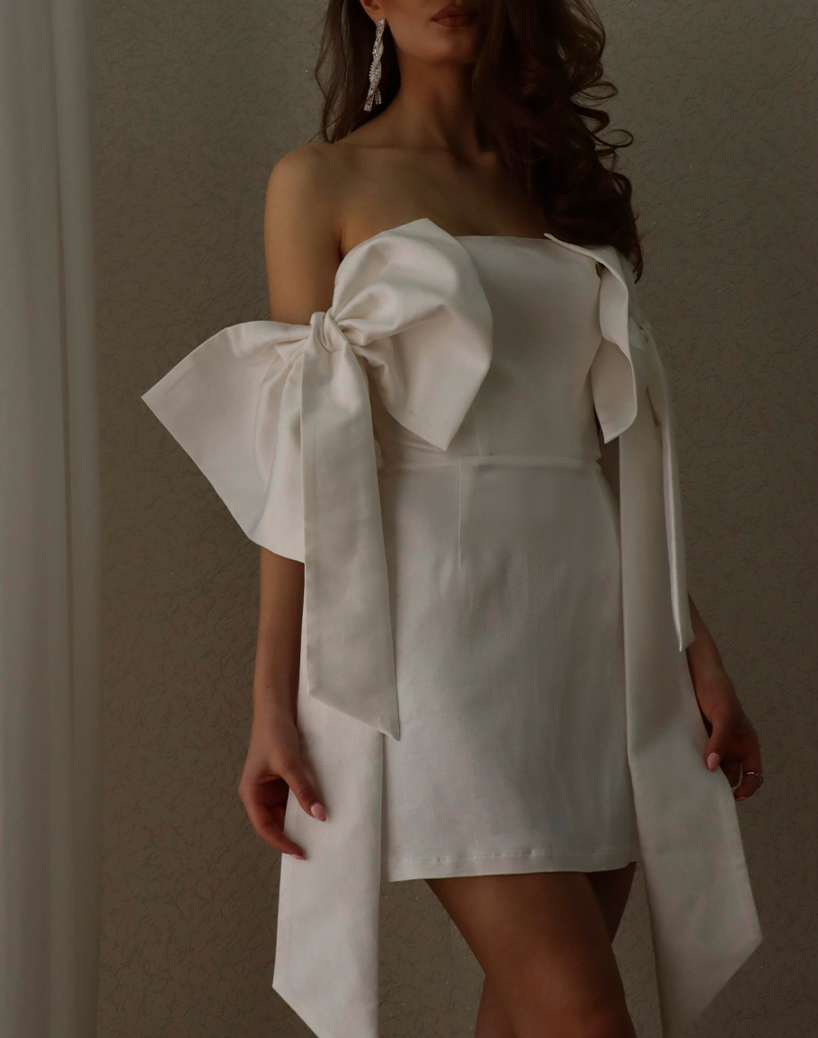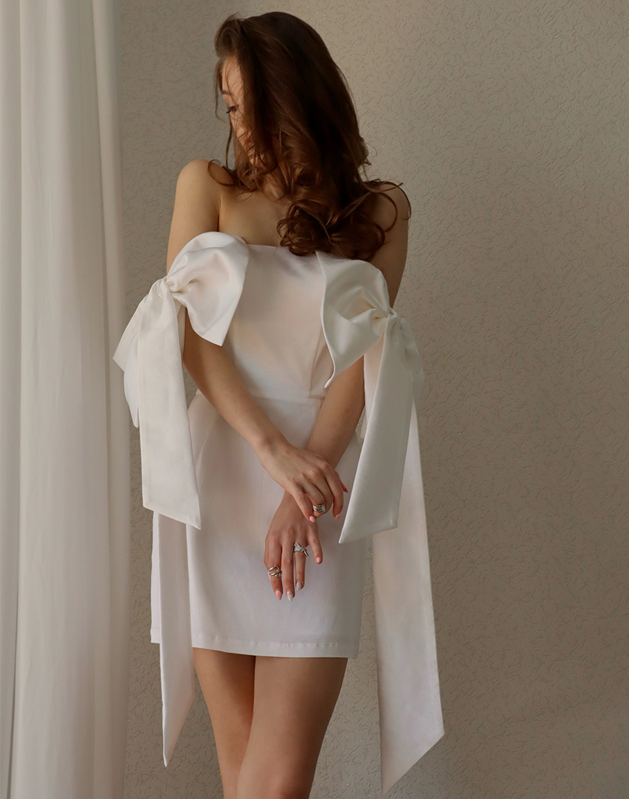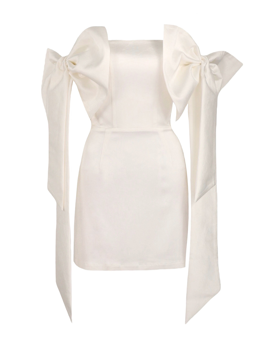 Рокля WHITE RIBBON в бял цвят с втален силует. Малката черна рокля е олицетворение на красота и изящство. Перфектната кройка, късата дължина и панделите на бялата рокля ви осигуряват една зашеметяваща визия за специален момент, в който ще се откриете. Добавете аксесоари и бижута и се насладате на момента. Дамската бяла мини рокля се предлага в размери XS, S и М.
