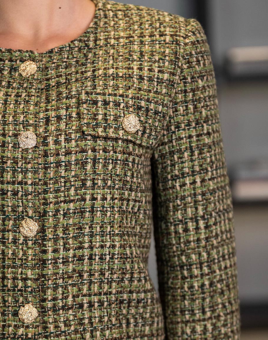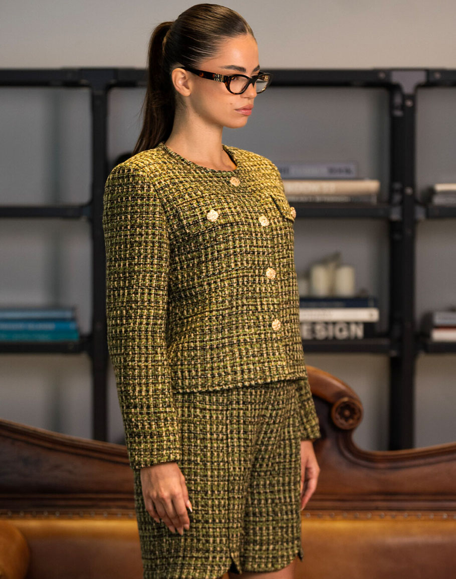 Сако ANORA в изящен зелен цвят съчетава класическа елегантност с модерен стил. Зеленото сако е конструирано от релефно тъкано букле с акцентни копчета на предната част. Моделът е с прав силует и овално деколте. Зеленото букле сако е подходящ за официални вечерни събития, както и за ежедневието на бизнес жени. За монохромна визия може да съчетаете с панталонки от същата серия на марката. Също така може да комбинирате с елегантен панталон, пола или рокля за шик визия или комбирайте с дънки и сникърси за спортно-елегантна. Всичко зависи от повода и настроението ви. Дамското зелено букле сако се предлага в размери S, M и L.