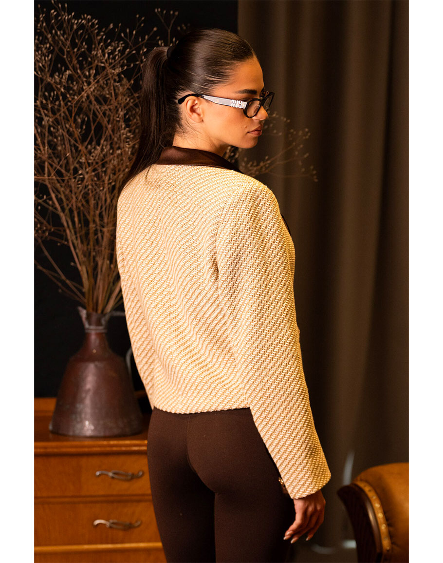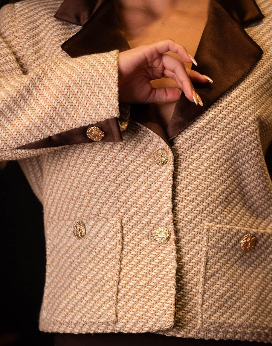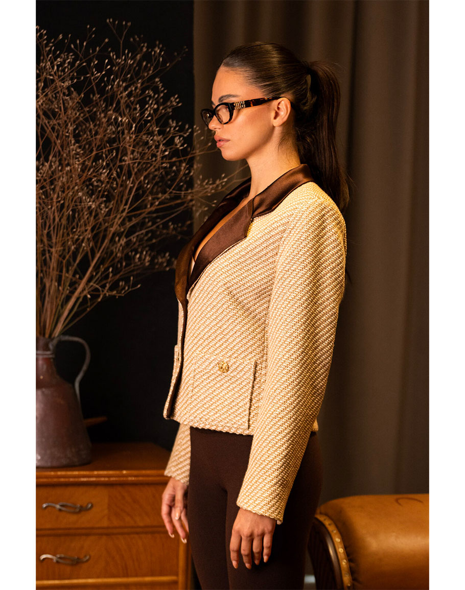Сако KAYLYN в красив нежен бежов цвят конструиран от релефно тъкано букле. Бежовото сако е с акцентни копчета на предната част и ръкавите. Сакото е с прав илует, V-образно деколте с ревер. Подходящ за официални вечерни събития, както и за ежедневието на бизнес жени. Съчетайте с елегантен панталон, пола или рокля за шик визия или комбирайте с дънки и сникърси за спортно-елегантна. Всичко зависи от повода и настроението ви. Дамското бежово букле сако се предлага в размери S, M и L.