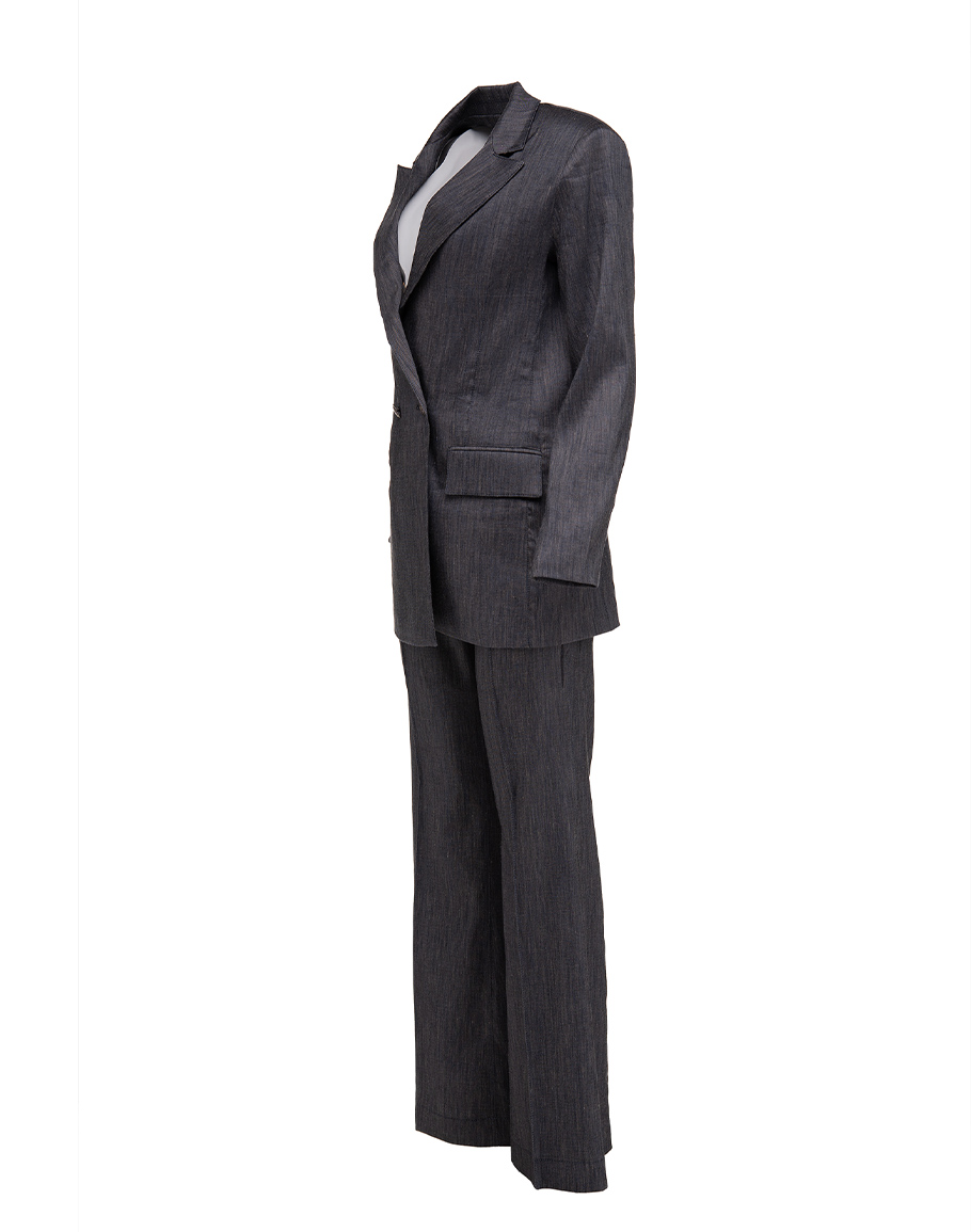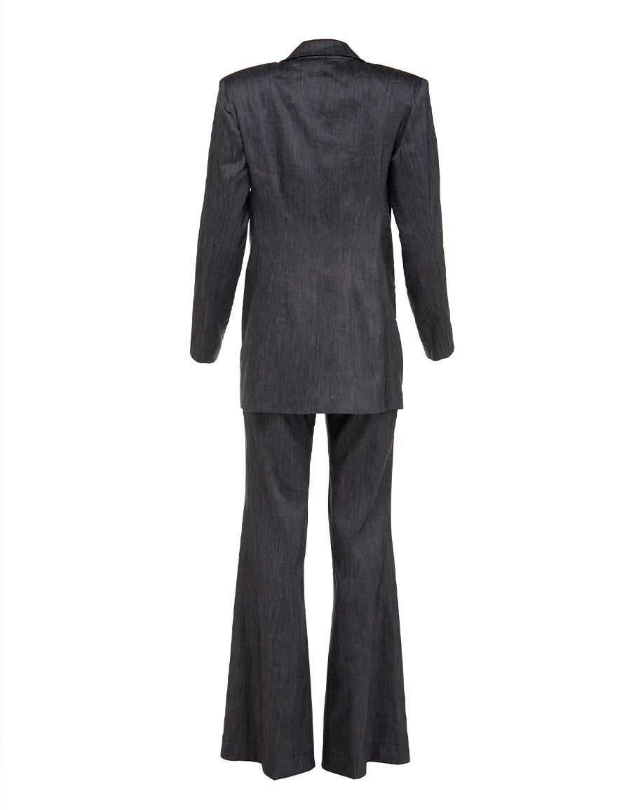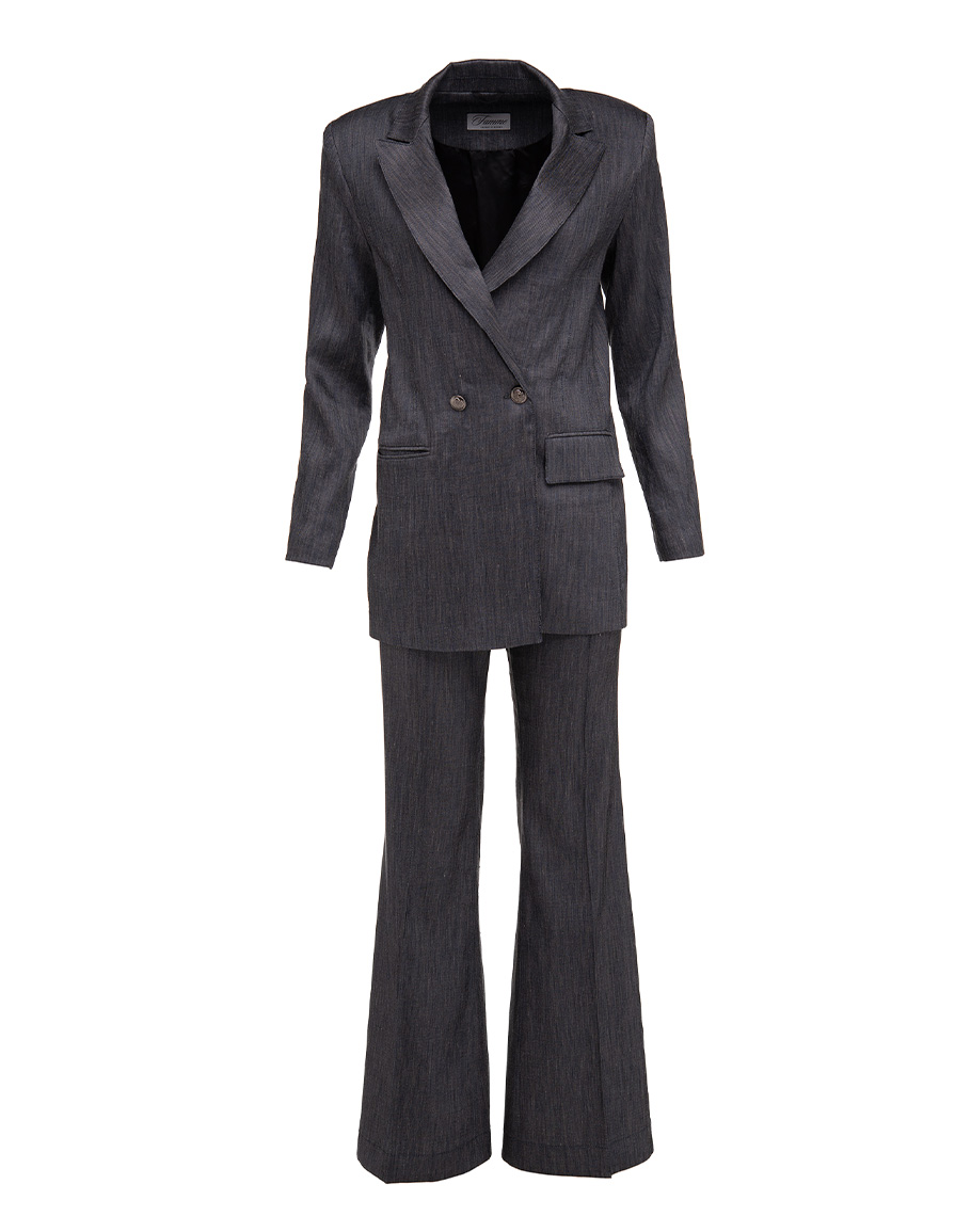 Сако от лен в графитен цвят конструирано от 100% лен с подчертана линия на раменете и удължена кройка. Елегантното сиво ленено сако е двуредово с действащи джобове. Подходящо за стилна офис визия или като част от модерен градски костюм. Леката структура на материята на сивото сако осигурява комфорт през пролетно-летния сезон. За монохромна визия съчетайте с панталон в същата серия от марката. Дамското ленено графитено сако се предлага в размери S/M и M/L.