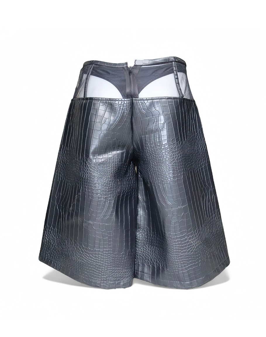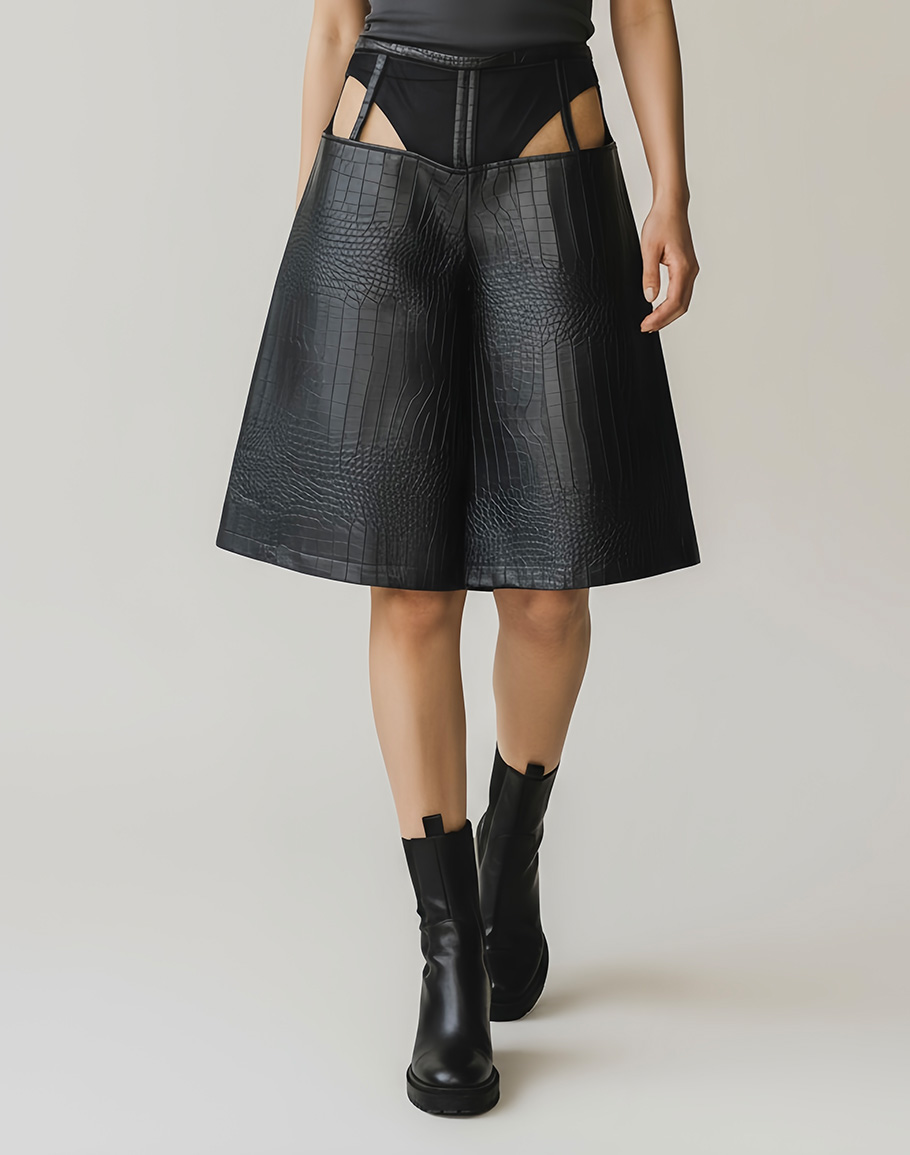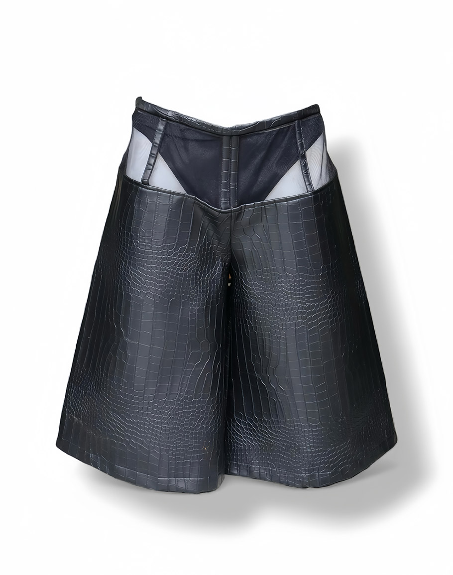 Бермуди с ниска талия BLCK 01 в черен цвят конструрирани изцяло от веган кожа. Черните кожени бермуди впечатляват с крокодилски ефект, който придава изразителна текстура и модерен характер. Кожените бермуди са с ниска талия и структуриран корсет, който оформя силуета и добавя елегантна завършеност. Съчетавайки смел дизайн и прецизна изработка, те са перфектен избор за визия, излъчваща увереност и стил. Дамските черни кожени бермуди с ниска талия се предлагат в размери XS, S, М и L.
