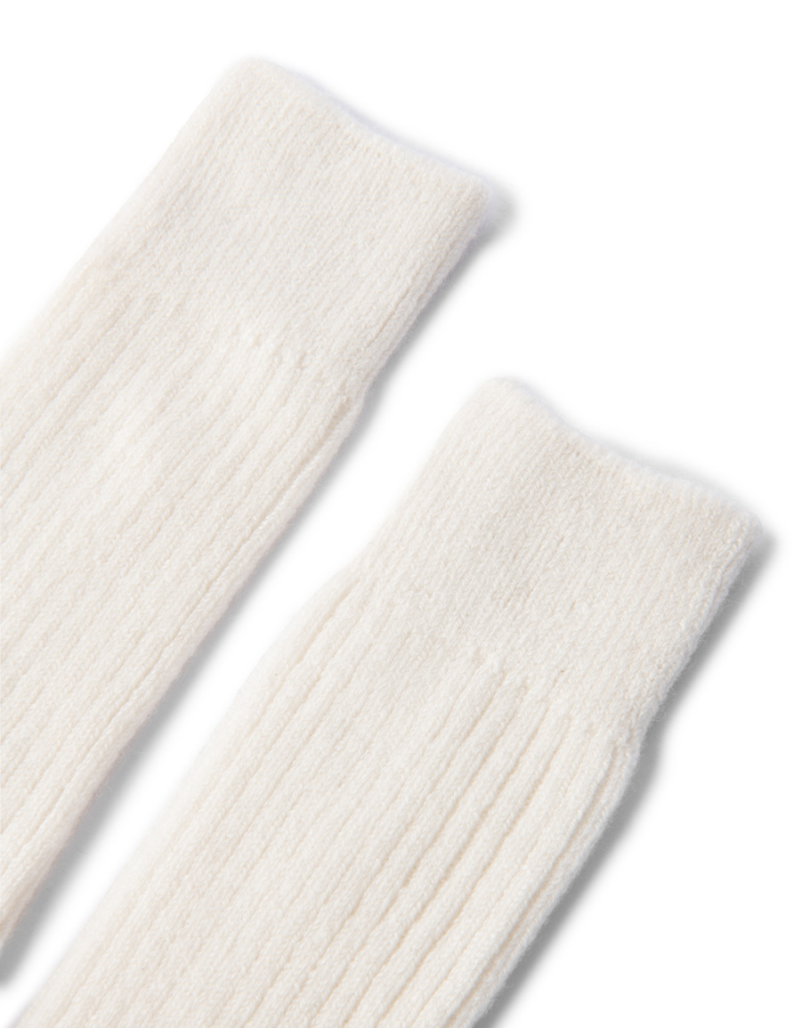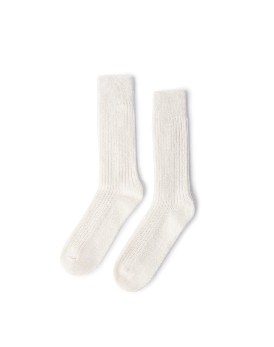 Дамски чорапи LA REINA WHITE в бял цвят изработени от 100% кашмир. Белите кашмирени чорапи впечатляват с изключителна мекота и топлина, осигурявайки комфорт през целия ден. Леките и фини влакна на кашмира ги правят нежни към кожата и подходящи както за домашен уют, така и за носене в ежедневието. Стилни, удобни и луксозни – тези кафяви кашмирени чорапи са идеалният акцент към всяка модерна визия или елегантен подарък. Дамските бели кашмирени чорапи се предлагат в универсален размер One-size.