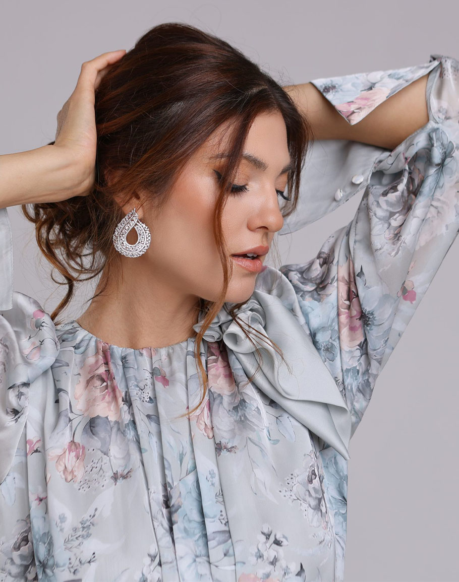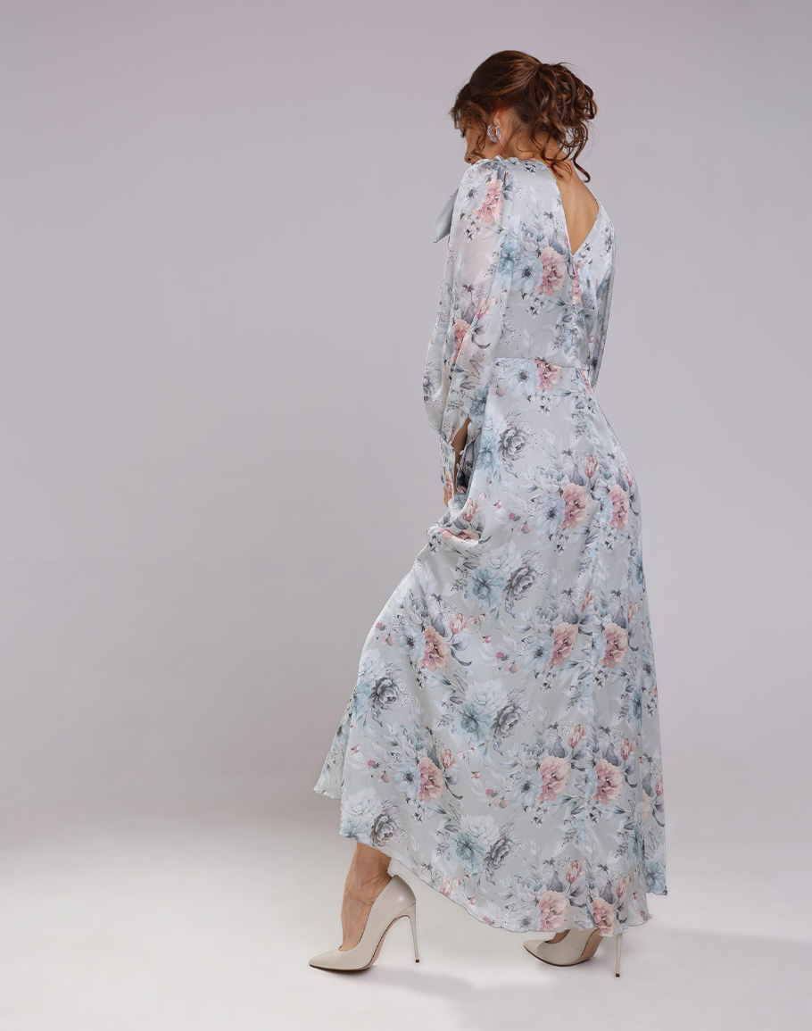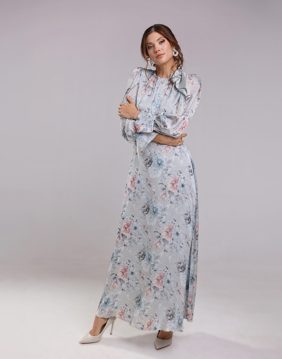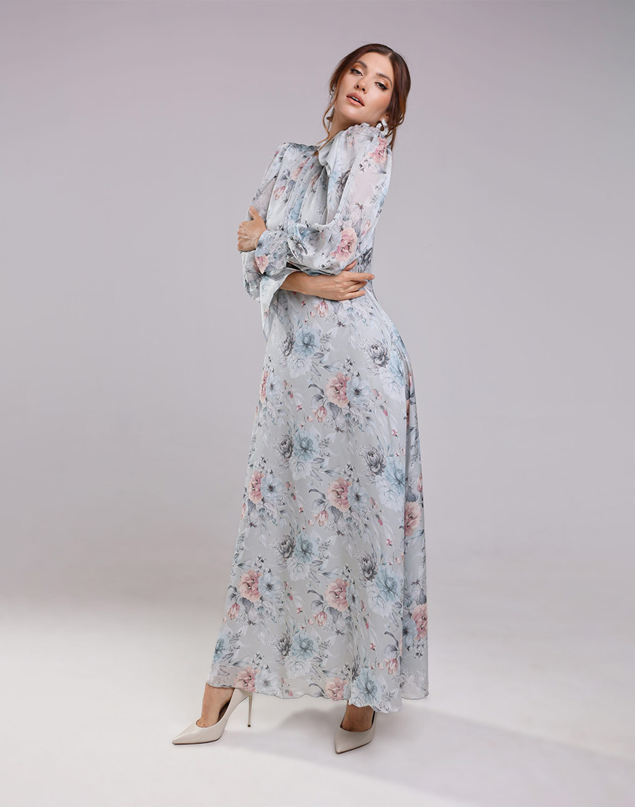 Рокля SECRET GARDEN изработена от лека, ефирна материя, която плавно следва движенията на тялото, създавайки усещане за свобода и елегантност. Дългата флорална рокля е с дълги ръкави, с лека обемност и маншети, придавайки изтънчен и класически стил. Кройката на роклята е свободна и падаща, а цялостният вид на модела е подходящ за официални поводи или вечерни събития. Основните цветове са пастелни, а флоралните елементи в розово, сиво и синьо добавят свежест и женственост. Добавете бижута и аксесоари за финален щрих на визията. Дамската дълга флорална рокля се предлага в размери XS, S, M и L.