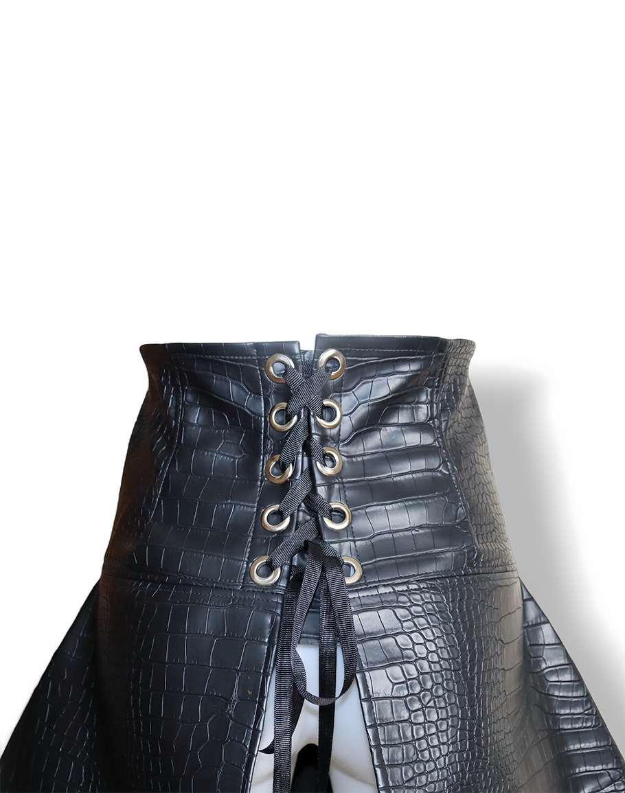 Колан KOPA в черен цвят изработен от веган кожа. Коланът е с крокодилски ефект и силует New Look. Силуетът на кожения колан подчертава талията и добавя елегантен акцент към всяка визия. Подходящ както за ежедневни, така и за по-официални тоалети, този колан е стилно допълнение към гардероба на всяка съвременна жена. Дамският черен кожен крокодилски колан се предлага в размери XS/S и M/L.