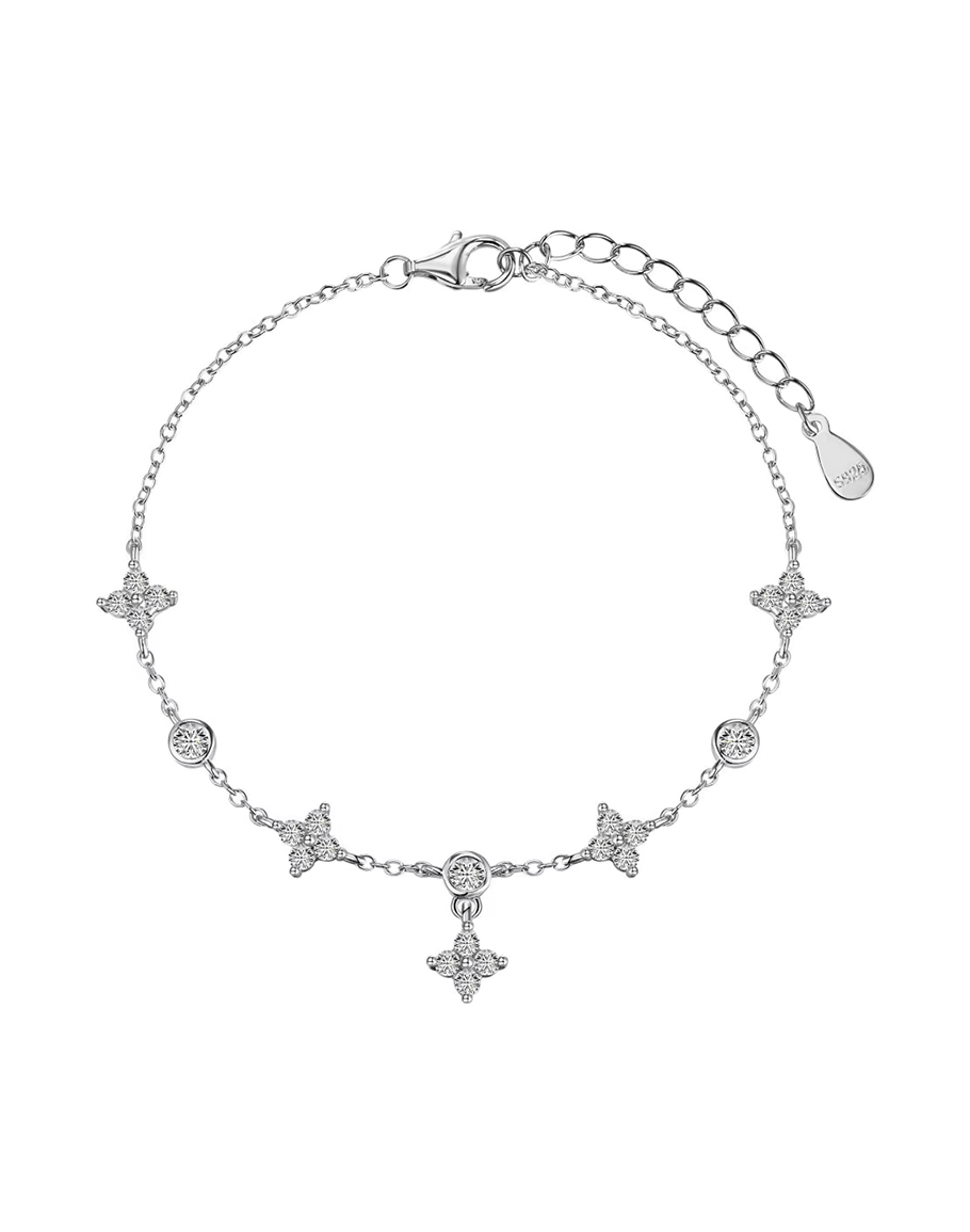Гривна SEYCHELLES декорирана с четири цветя, инкрустирани с кристали, и три брилянтни кръгли камъка, деликатно разположени по фина верижка от стерлингово сребро 925. Единичната капка цвете добавя меко движение и чар на сребърната гривна. Завършена с родий, сребърната гривна е лека, женствена и пълна с фини детайли — като бижу, изработено от слънчева светлина. Дамската сребърна гривна с камъни е красив и изящен подарък за любим човек.