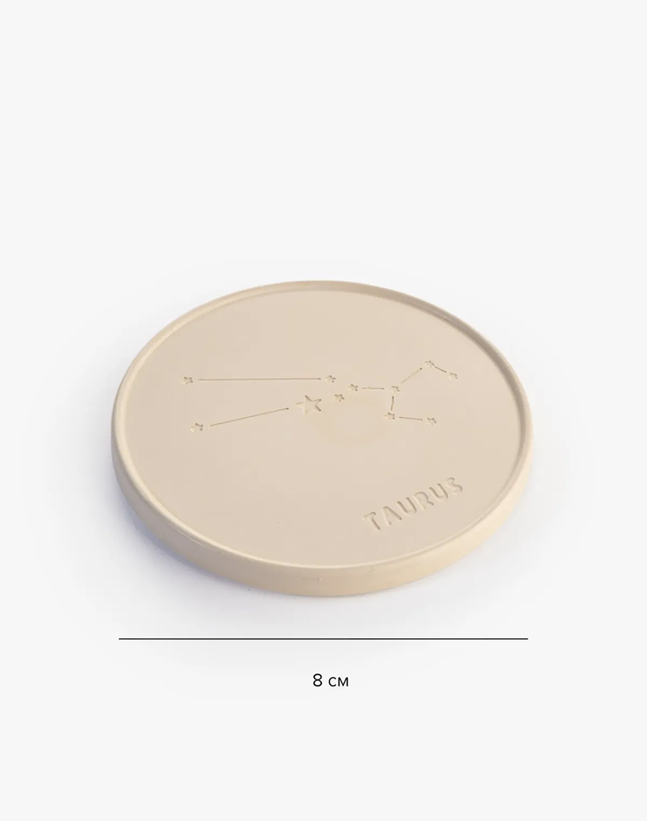Подложка TAURUS в красив бежов цвят, който е перфектен за всяко пространство. Малката подложка е за зодия Телец, която няма да събере всичките му любими неща за ядене. Върху подложката може да поставите 1 свещ или бижута. Или каквото друго ви стои красиво. Подложката е изработена от Jesmonite – гипсов материал на водна основа, който е безопасен за вас и природата: