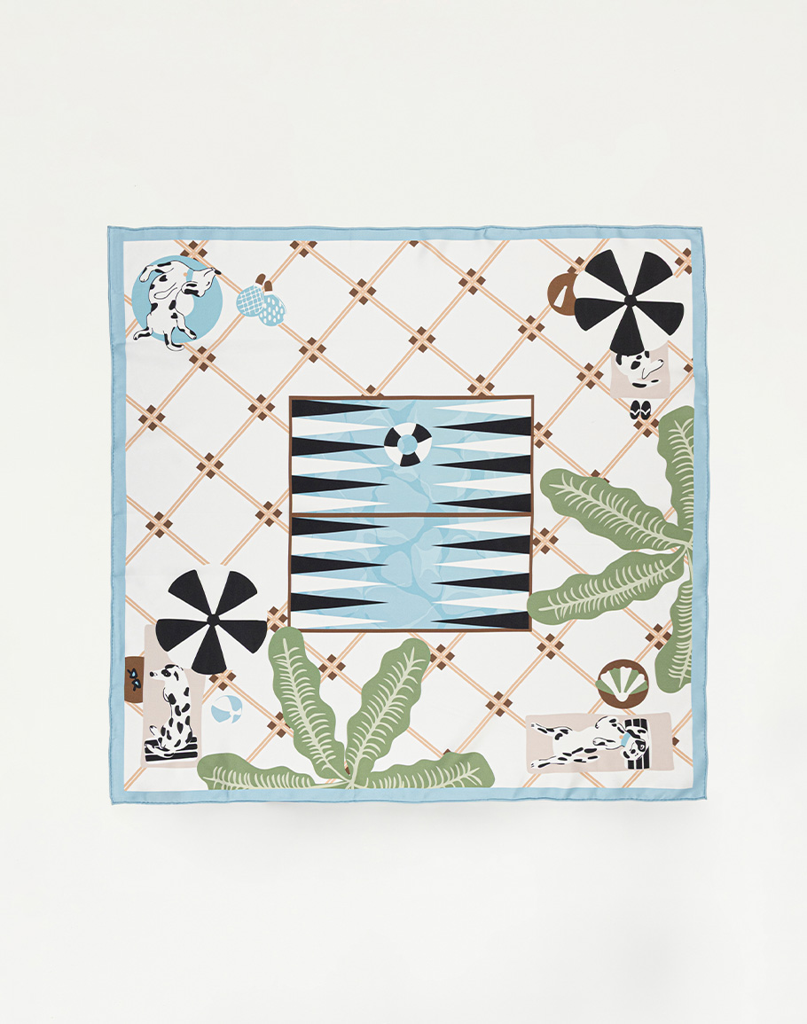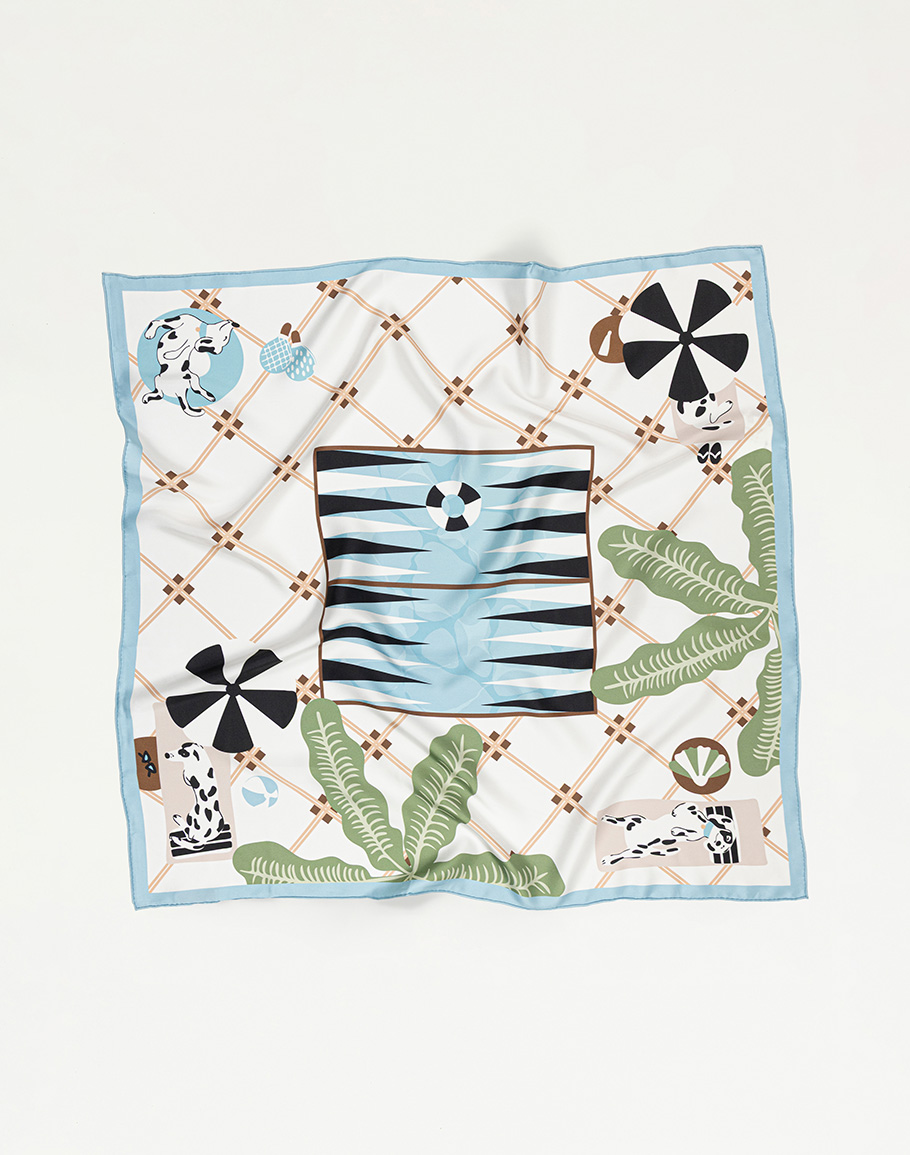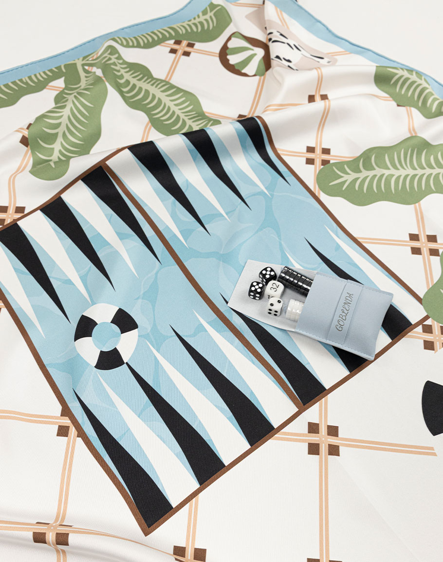 Копринен шал BACKGAMMON стил и игра в едно. Този изискан копринен шал съчетава класическа елегантност с духа на вечната игра табла. Върху фината коприна е създадена илюстрация с артистична табла, превръщайки аксесоара в истинско бижу – едновременно модно и вдъхновяващо. Към шала е включен и специален подаръчен комплект с пулове и зарчета, който ви позволява да се насладите на играта навсякъде и по всяко време. Перфектен избор за ценители на детайла, любители на стратегическите игри и хора със стил. Идеален подарък, който носи удоволствие, емоция и изтънченост – защото истинската игра никога не излиза от мода. Този изящен копринен шал с размери 90×90 см е създаден от 100% висококачествена коприна Mulberry Silk, която му придава невероятна мекота, нежен блясък и усещане за абсолютен лукс. Двустранно печатан и с изискан ръчен подгъв, коприненият шал е истинско произведение на изкуството. Всеки модел е част от лимитирана серия от само 150 броя, като всеки шал пристига със сертификат за автентичност, подчертавайки неговата уникалност и колекционерска стойност.