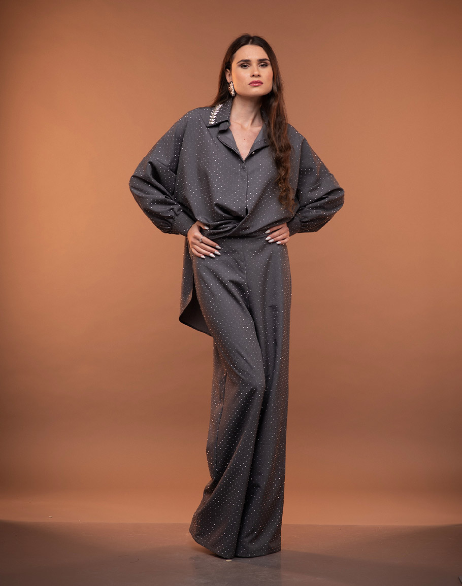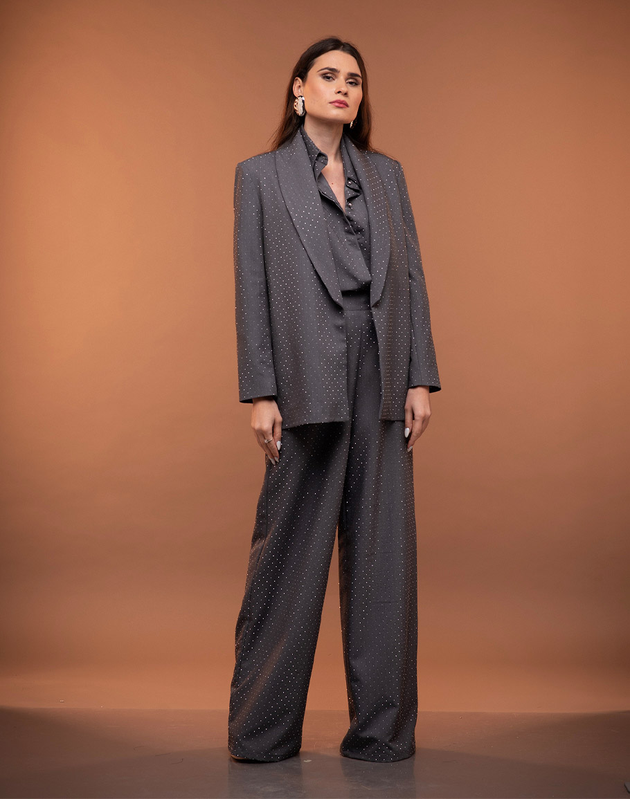 Панталон IVON SHINE обсипан с кристали в сив цвят е задължителна част от гардероба на съвременната жена. Свободната, но прецизна кройка на сивия панталон създава елегантен и издължен силует, който съчетава комфорт и стил. Скъпата, висококачествена материя придава луксозно излъчване и за лекота при движение. Сивият нюанс носи изисканост, като същевременно прави панталона изключително лесен за комбиниране с различни цветове и текстури. Правият свободен панталон е подходящ както за ежедневни визии, така и за по-елегантни поводи. Този сив панталон отразява модерния вкус и практичния стил на жената, която цени качеството, комфорта и актуалната естетика. Дамският сив прав панталон се предлага в размер XS-M.