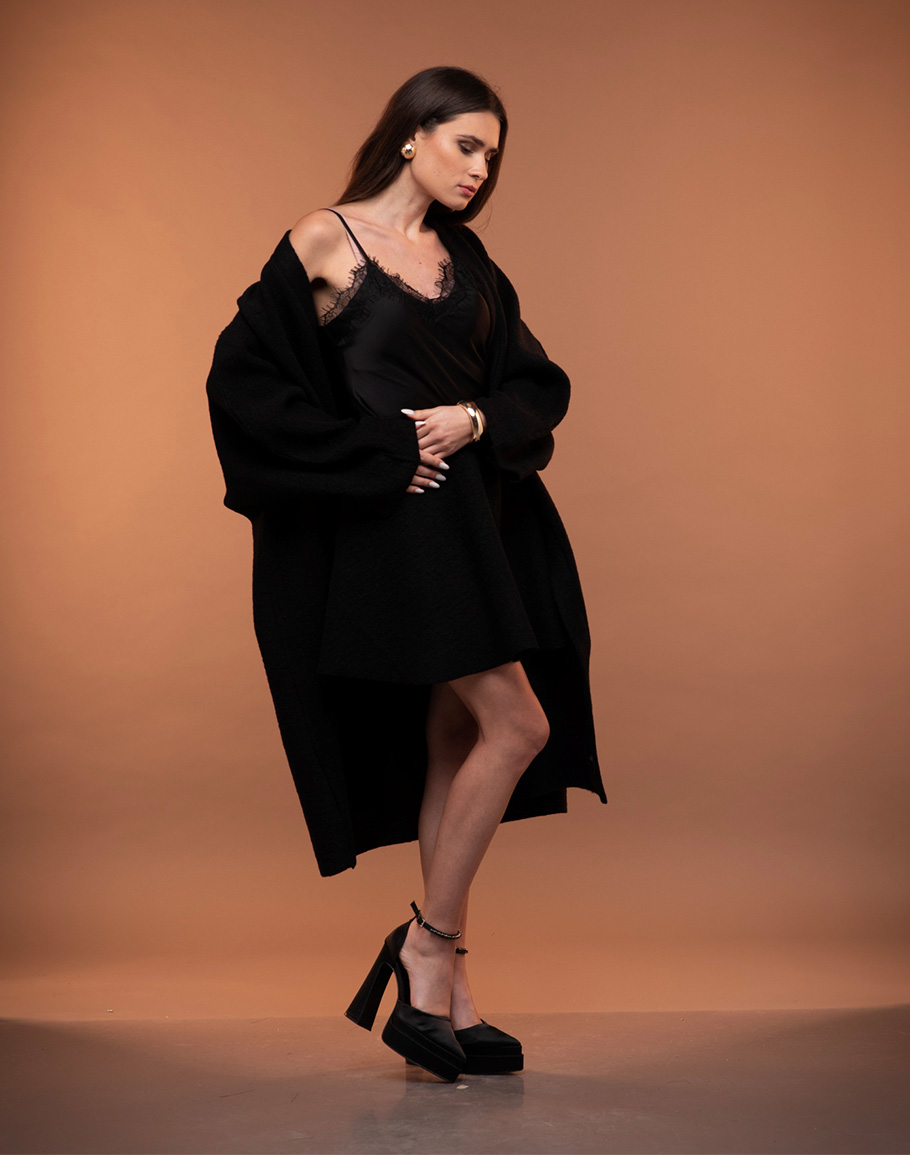 Пола STELA WOOL в черен цвят конструирана от варена вълна е е стилен и изискан акцент с подчертана женственост. Материята на черната къса пола оформя фигурата, като придава красив, подреден силует и усещане за елегантна структура. Нежната вълна добавя фин визуален интерес и лек френски привкус, който прави полата едновременно класически и актуален. Черната пола е изключително лесна за съчетаване – комбинира се прекрасно с ризи, фини плетива, сако или елегантни топове, което я превръща в универсален елемент за различни визии. Късата черна пола е подходяща както за ежедневие, така и за по-специални поводи, тя е практичен и стилен избор за гардероб, в който се търси баланс между комфорт, естетика и модерна елегантност. Дамската къса черна вълнена пола се предлага в размер XS-L.