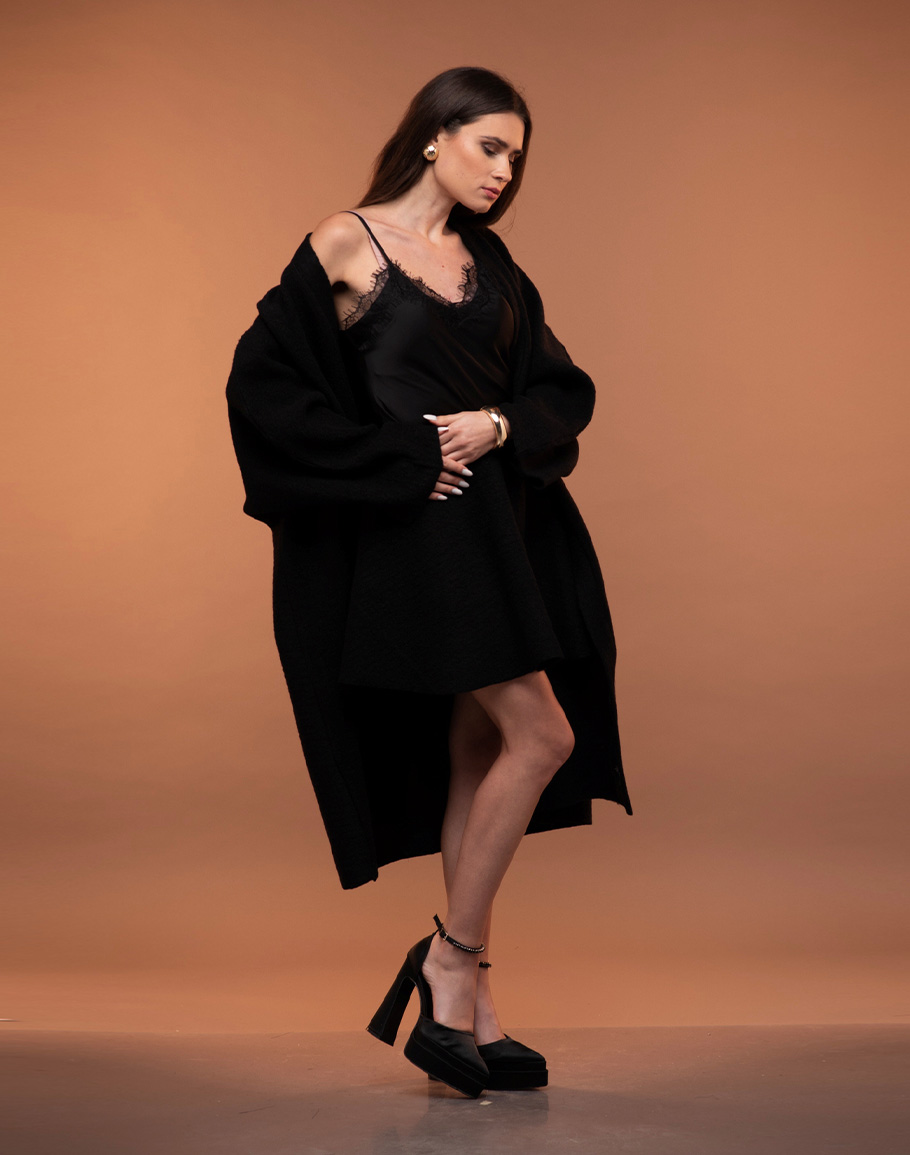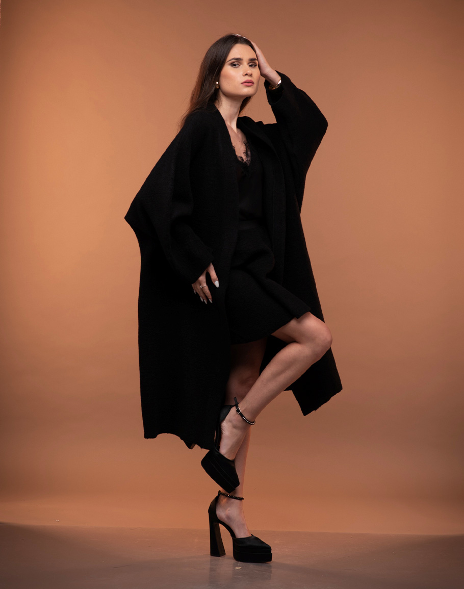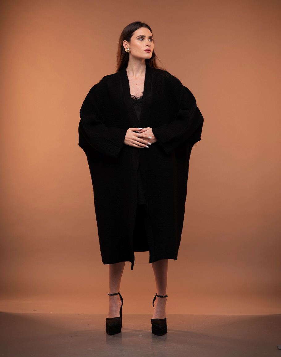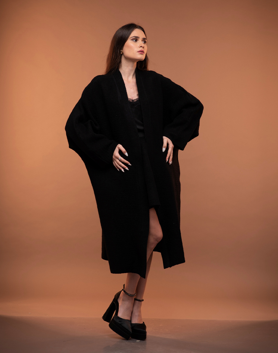 Жилетка ANNA WOOL в черен цвят изработена от варена вълна в класическо черно е незаменим елемент за студените дни. Оувърсайз силуетът на черната вълнена жилетка създава усещане за уют и модерна небрежност, като същевременно позволява лесно наслояване върху различни визии. Варената вълна осигурява отлична топлина и структура, запазвайки формата си и придавайки изискан завършек. Класическият черен цвят прави жилетката изключително комбинативна – перфектно допълнение както към ежедневни аутфити с дънки и пуловер, така и към по-елегантни рокли и сетове. Тази черна дълга жилетка съчетава комфорт, функционалност и стил, превръщайки се в универсална основа за всеки гардероб. Дамската черна дълга вълнена жилетка се предлага в размер One-size.