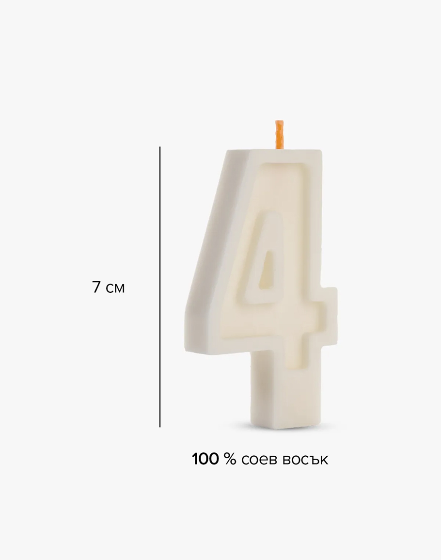 Соева свещ за торта 4 ръчно изработена от соев восък с цветен фитил от 100% памук. Изберете тази натурална соева свещ да отпразнувате рожден ден или годишнина. Времето на горене е 30 повторения на „Happy Birthday“ или около 15 минути. Свещта се предлага в индивидуална крафт кутийка, което я прави подходяща и за подарък.