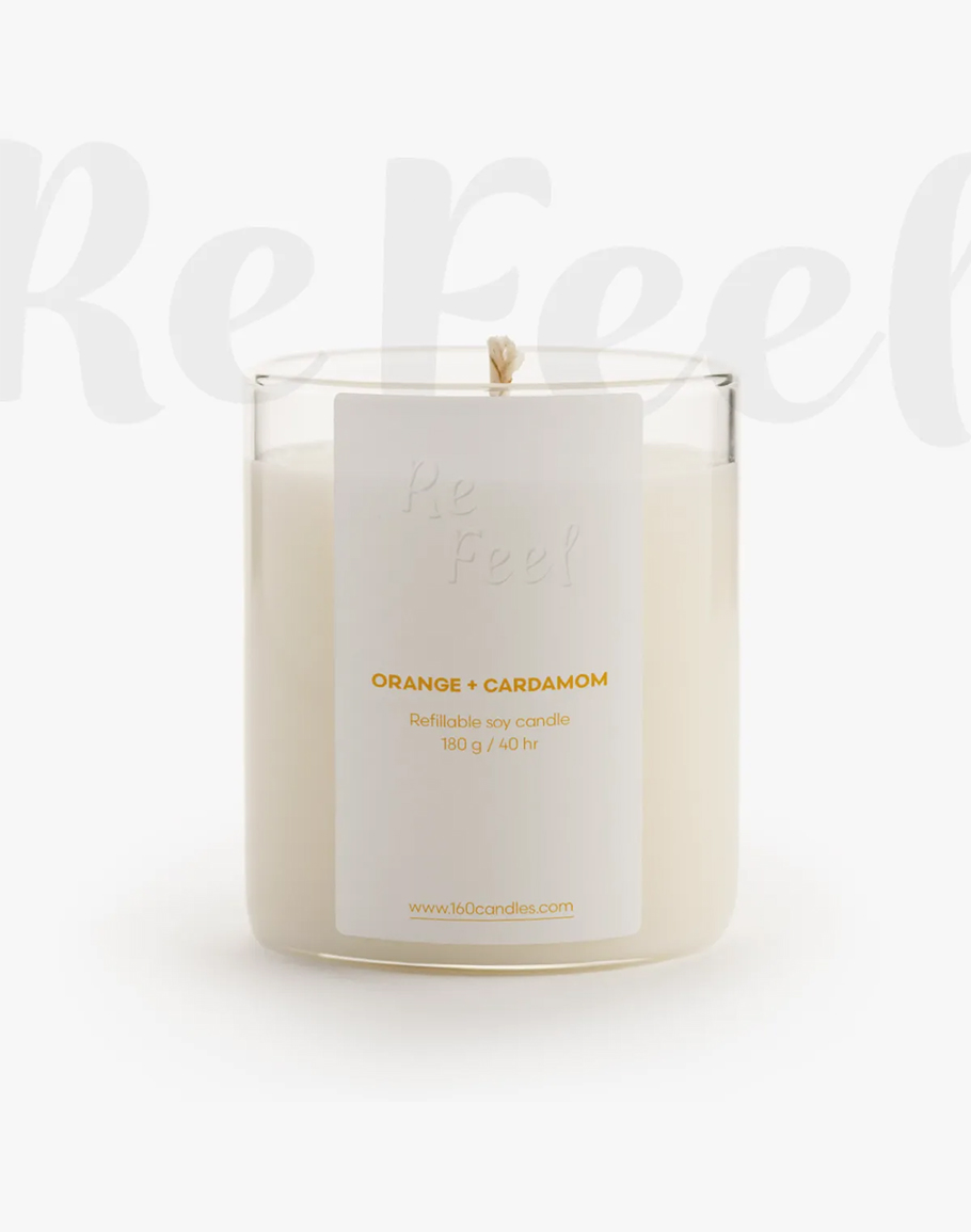 Свещ REFEEL ORANGE CARDAMOM със свеж портокал в прегръдка с пикантността на кардамон. Ароматът на соевата свещ буквално ви зарежда с енергия. Екзотично ухание с вълнуващи цитрусови пръски и топло ванилово сърце. Свещта е изработена натурален соев восък, който не отделя сажди и не замърсява въздуха в вашия дом. Свещта е част от първата колекция на марката refillable – създадена да даде по-дълъг живот на всеки съд и да намали излишните отпадъци. Пълнителите са лесни за поставяне и идват в различни аромати. По-достъпно за вас, по-щадящо за планетата! Свещта идва без кутия – защото всички знаем къде отива тя след 2 минути: право в кошчето за боклук. 160 CANDLES вярват, че това е малка стъпка към по-малко отпадъци и по-устойчиво потребление. Свещта е обогатена с премиум ароматни масла, сертифицирани в съответствие с Международната асоциация за аромати (IFRA).