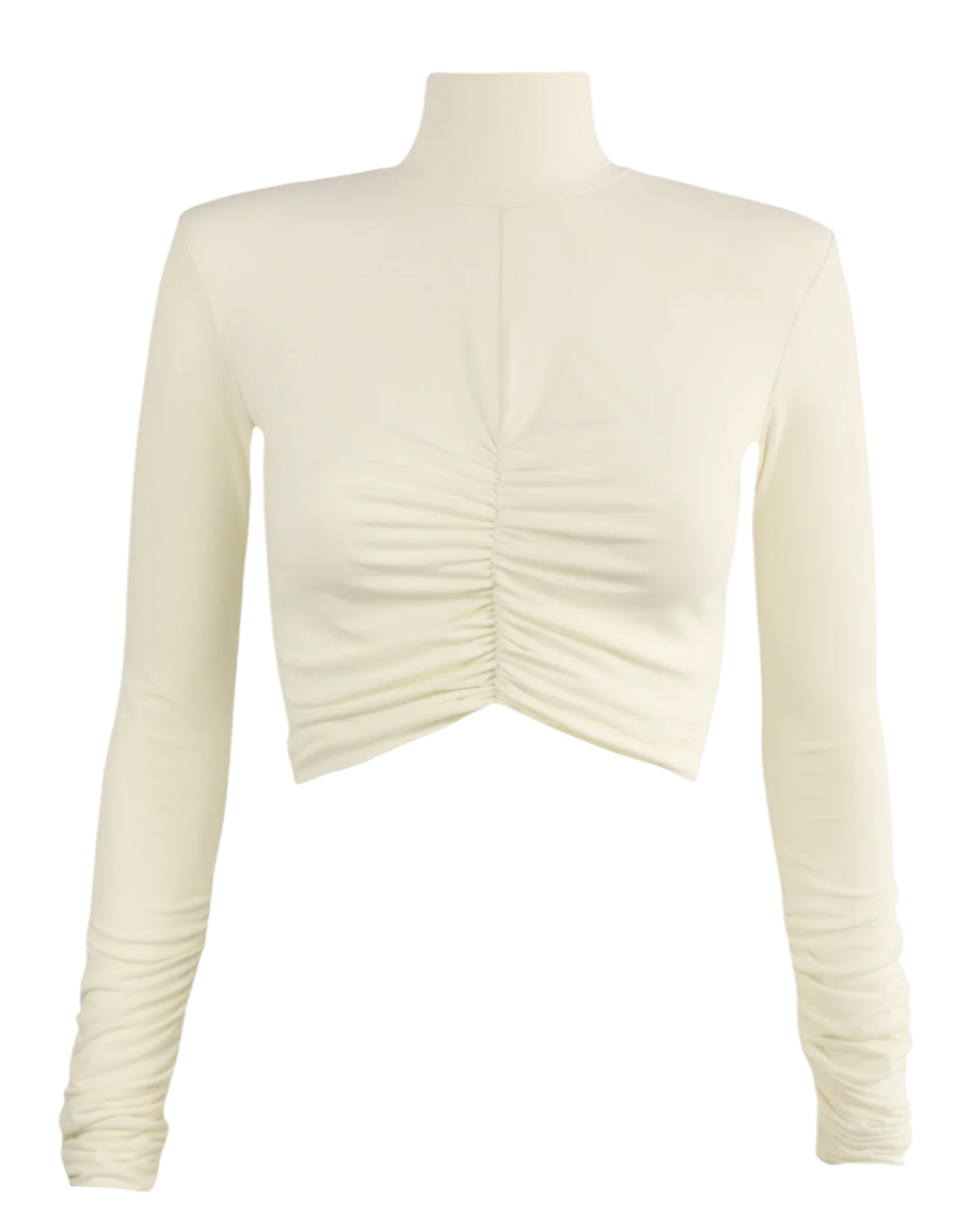 Блуза WHITE ARROW в бял цвят изработена от трикотажна материя, в състава на която влизат вискоза и полиестер. Бялата блуза е с втален силует, висока поло яка, дълъг ръкав и набран асиметричен ефект в долната си част. Материята на бялата блуза е удобна, приятна на допир, добре подчертава фигурата и е устойчива към износване. Дамската бяла блуза се предлага в размери XS, S и M.