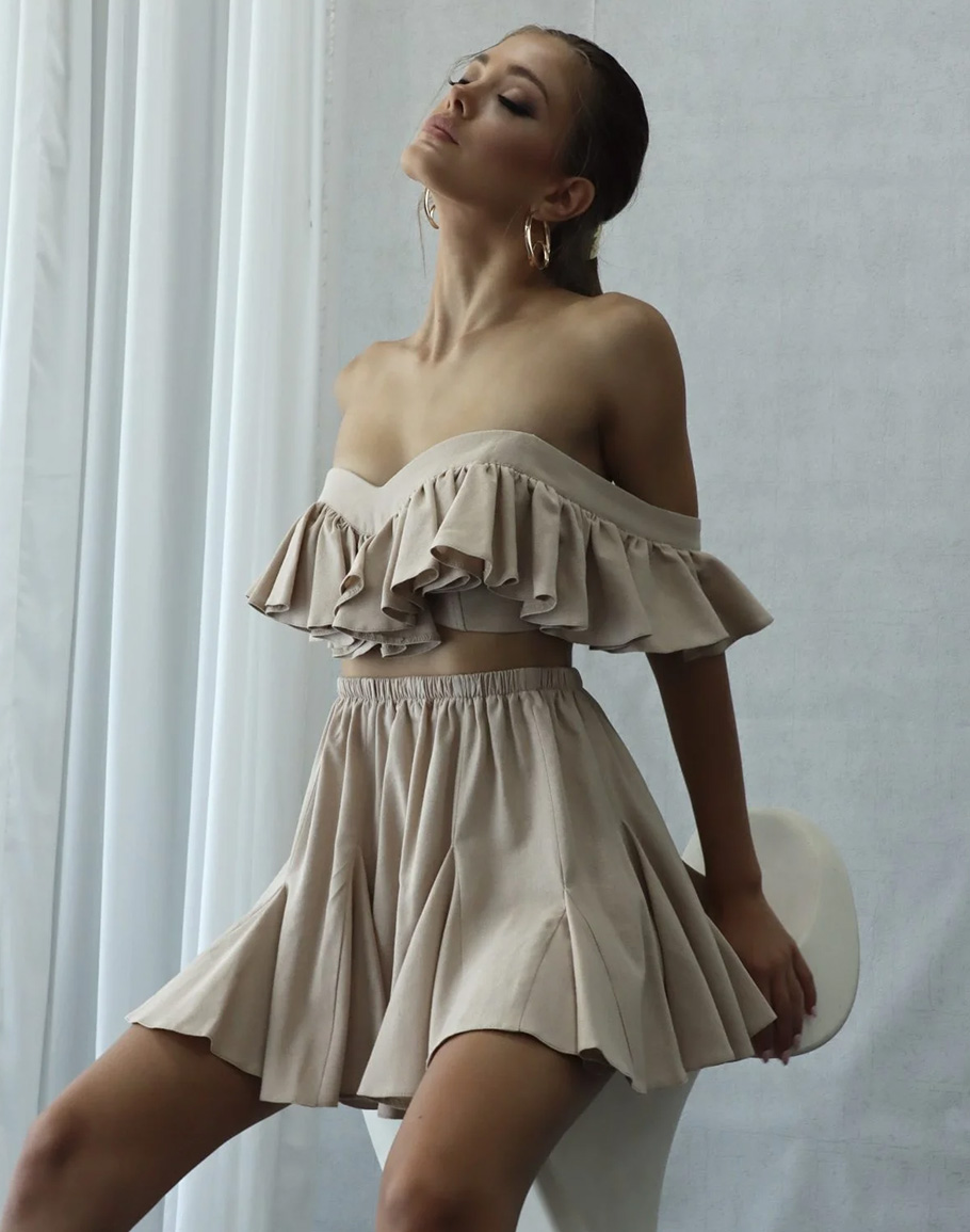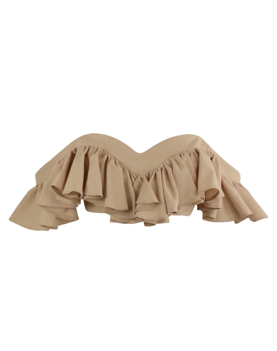 Бюстие NUDE WAVES LINEN в телесен цвят изработено от нежна ленена материя с вискоза. Телесното бюстие впечатлява с романтична, свободна кройка и феерични къдри, които добавят движение и женственост. Моделът е с V-образно, леко овално деколте, създаващо деликатна и ефирна визия, като нежно разкрива раменете. Бюстието с къдри е идеален избор за лятото – едновременно стилен, комфортен и универсален за различни комбинации. Дамското кроп бюстие с къдри се предлага в размери XS/S и M/L.