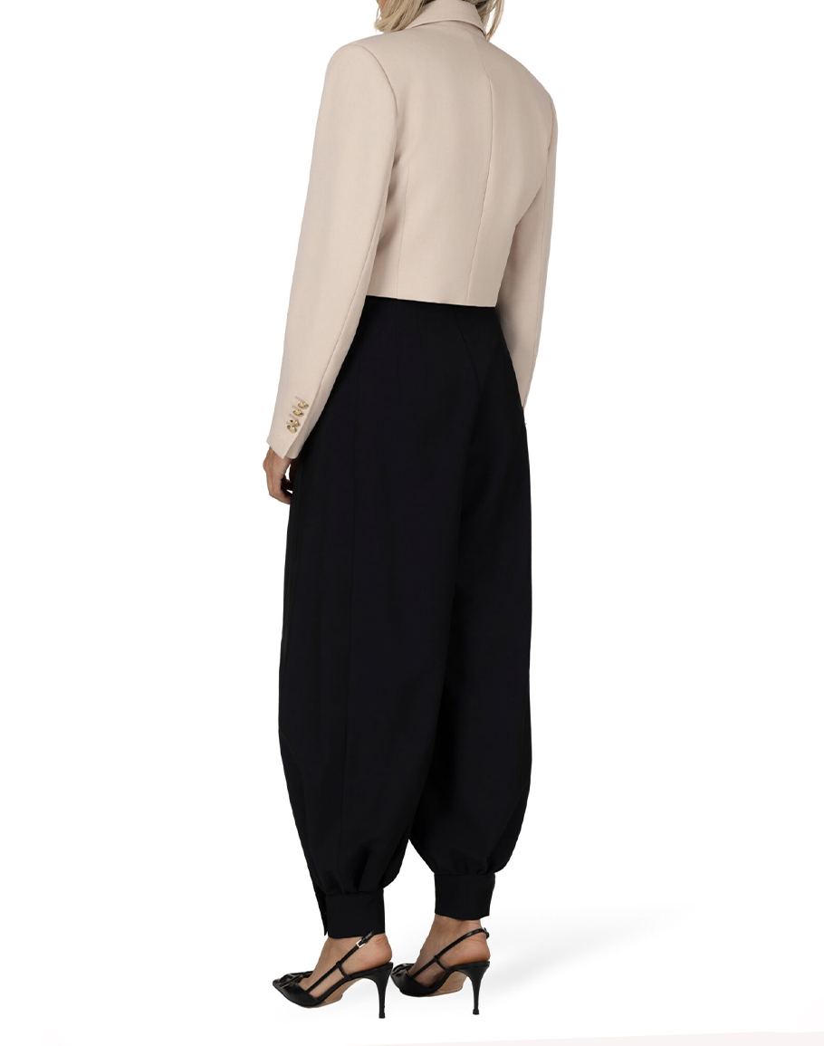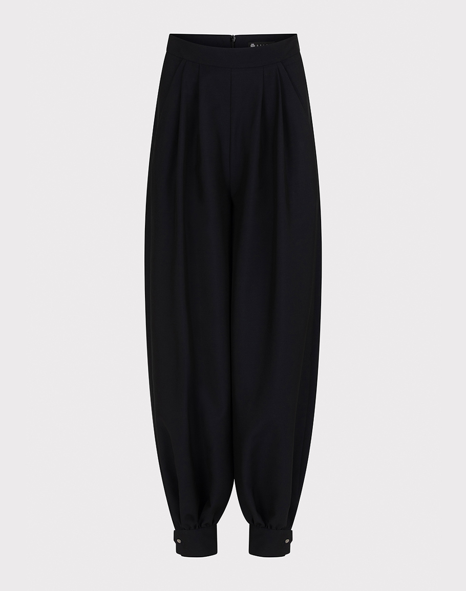 детайли: свободна горната част, стеснен глезен, скрит цип, маншети с копчета, декоративни гънки в страни