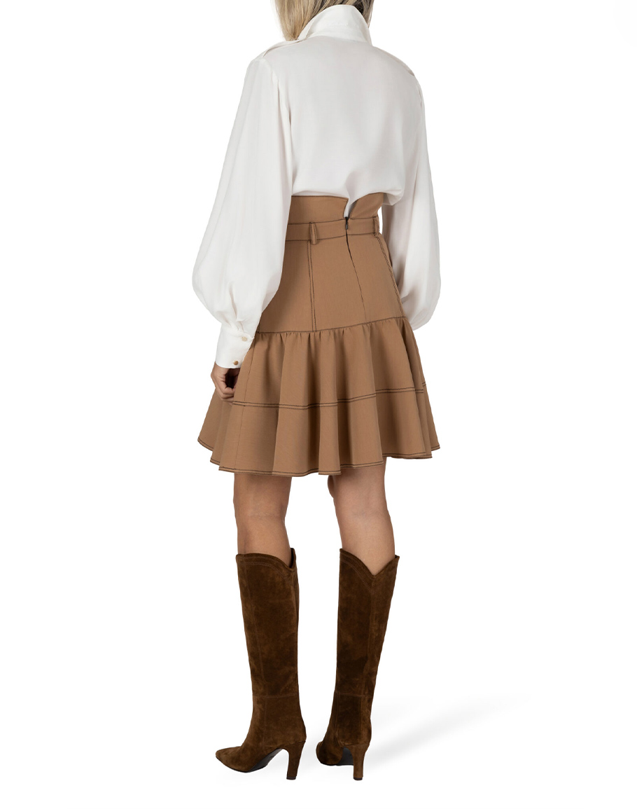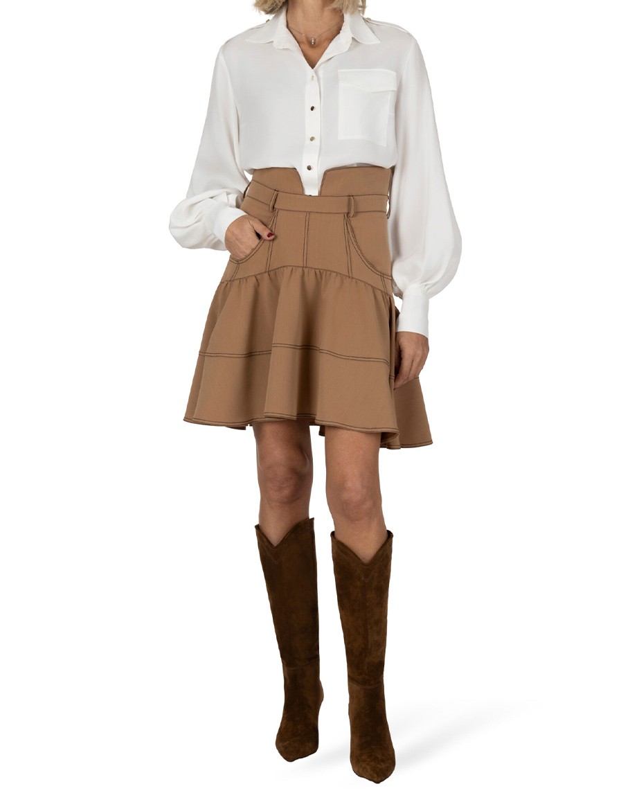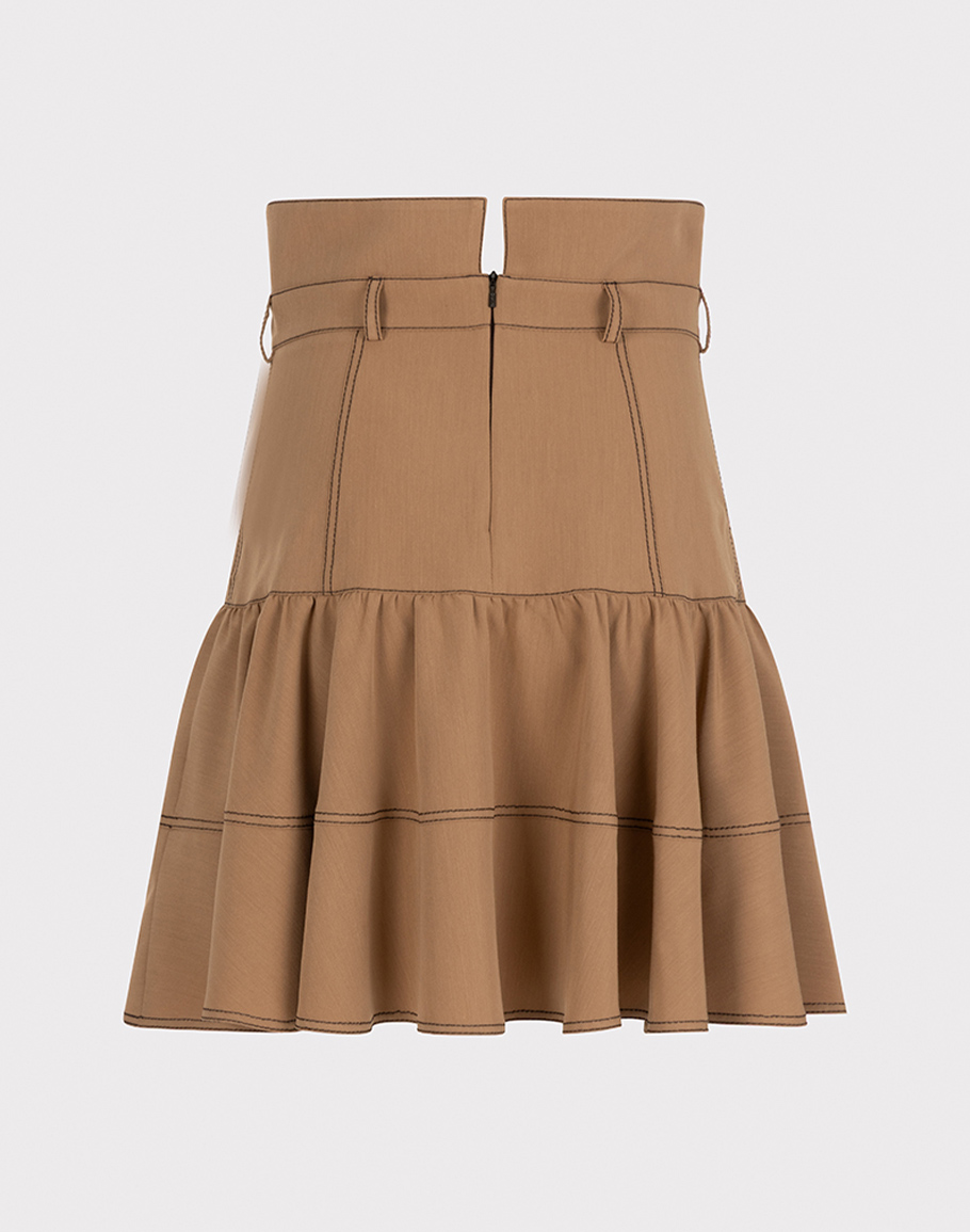Къса пола с висока талия и волан в красив камел цвят впечатлява с елегантен силует и внимателно подбрани детайли. Изработена от поливискоза, късата кафява пола осигурява удобство и структура през целия ден. Високата талия на кафявата пола подчертава фигурата, а разкроената долна част с волан придава движение и женственост. Контрастните декоративни шевове на полата създават модерен акцент и подчертават линията на модела. Полата е подходяща за комбинация с риза, блуза или пуловер и може да се носи както с токчета, така и с ботуши за по-ежедневна визия. Дамската кафява къса пола с висока талия и волан се предлага в размери 34, 36, 38, 40 и 42.