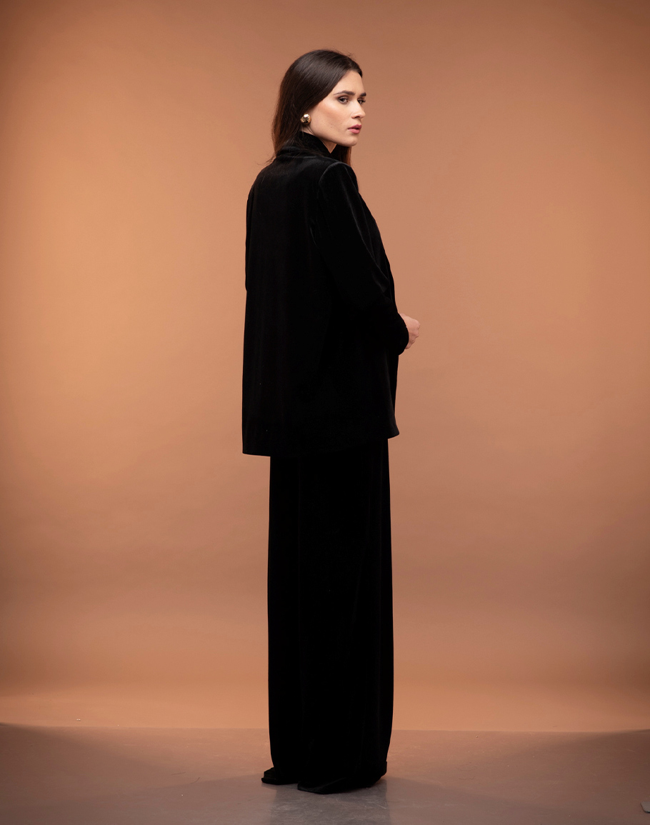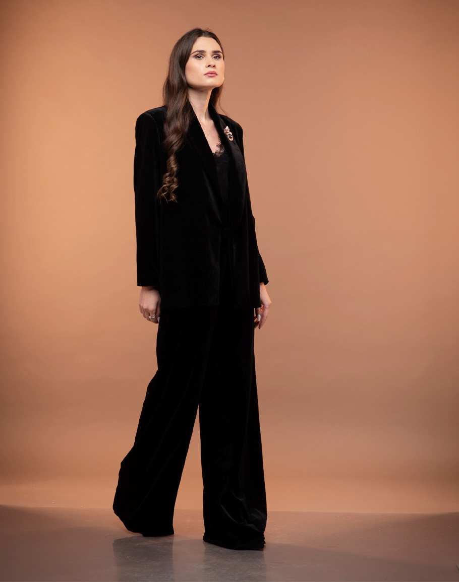 Костюм LIDA VELLUTO в черен цвят от меко кадифе е изискано съчетание между комфорт, стил и френска естетика. Сакото на черния костюм впечатлява с нежната си текстура и прецизна линия, която оформя красив и женствен силует, без да бъде прекалено строга. Правият панталон издължава фигурата и създава усещане за лекота и баланс, подчертавайки елегантната стойка. Луксозният вид на кадифето придава класа и финес на този черен костюм. Лесен за комбиниране с различни топове, ризи и аксесоари, този кадифен черен костюм е универсален избор както за специални поводи, така и за стилно ежедневие с безупречен, френски почерк. Дамският кадифен черен костюм се предлага в размер XS-L.
