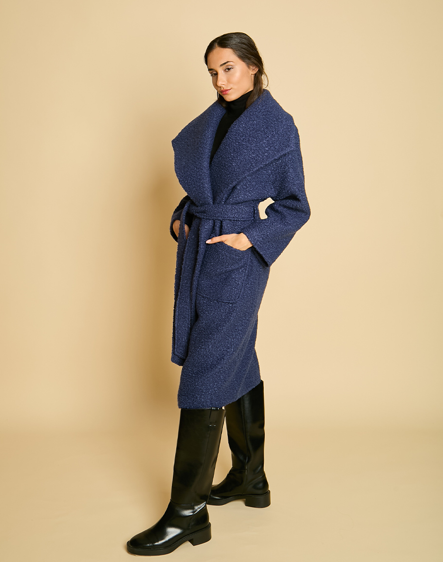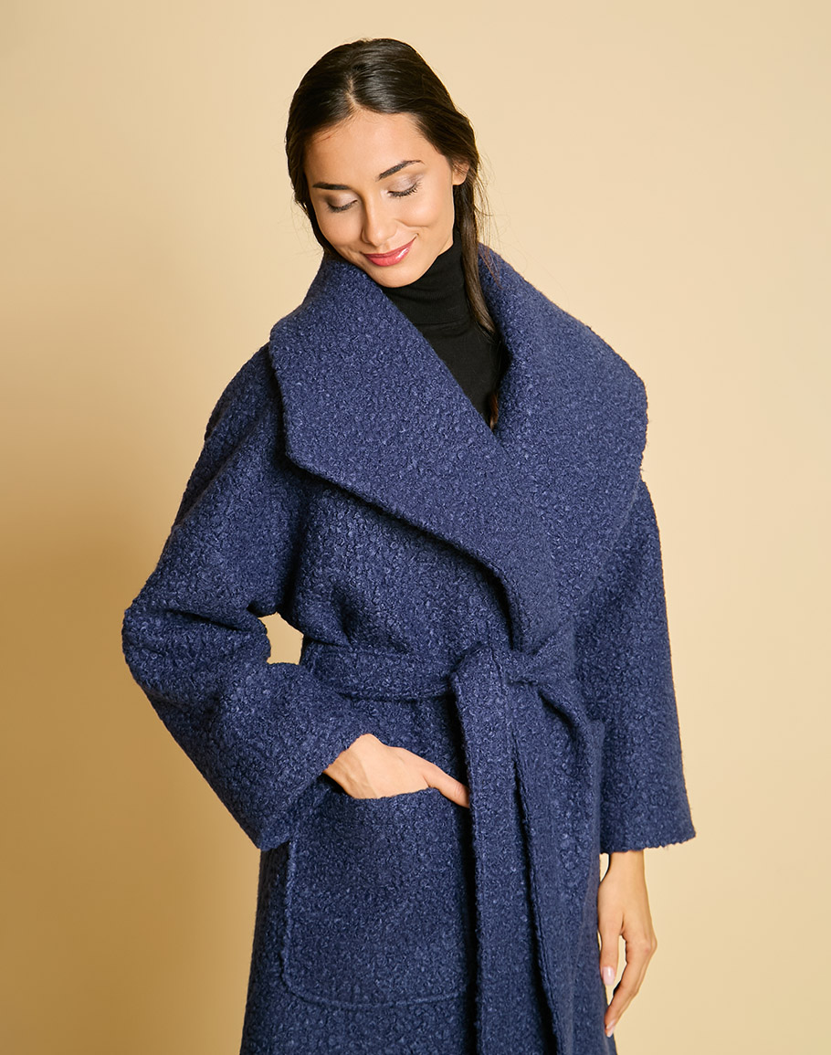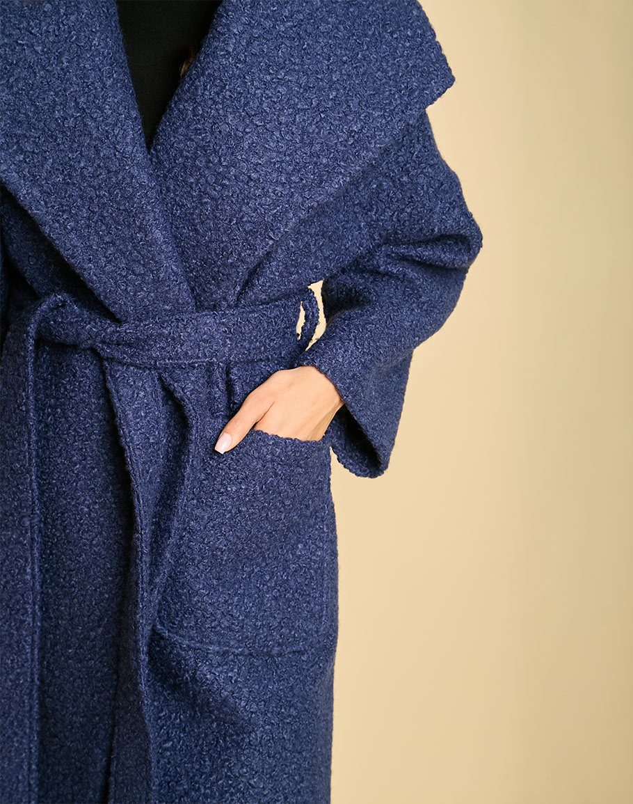 Палто DALIA в неустоим цвят боровинка изработено от изключително меко, топло и леко вълнено букле. Палтото е тип “прегърни ме” с много голяма яка, предни въшни джобове и колан който подчертава талията и придава елегантен силует. Вълненото палто съчетава уют и стил, идеално както за градски разходки, така и за по-официални визии през студените дни. Луксозната текстура и наситеният цвят придават изискан завършек на всеки тоалет. Дамското вълнено боровинково палто се предлага в размери S, M и L.