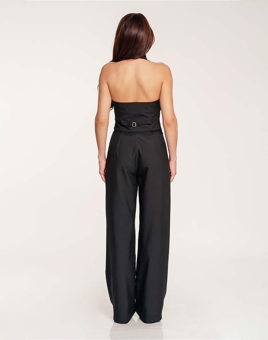 Панталон MONA в черен цвят изработен от висококачествена вискоза. Черният панталон е с класическа елегантна кройка, висока талия и басти, които оформят силуета. Широкият крачол осигурява свобода на движението и комфорт, като придава изискано и модерно излъчване. Черният широк панталон е подходящ както за официални поводи, така и за стилна ежедневна визия. За монохромна визия съчетайте с елек RAMONA от марката. Дамският черен панталон се предлага в размери XS, S и M.