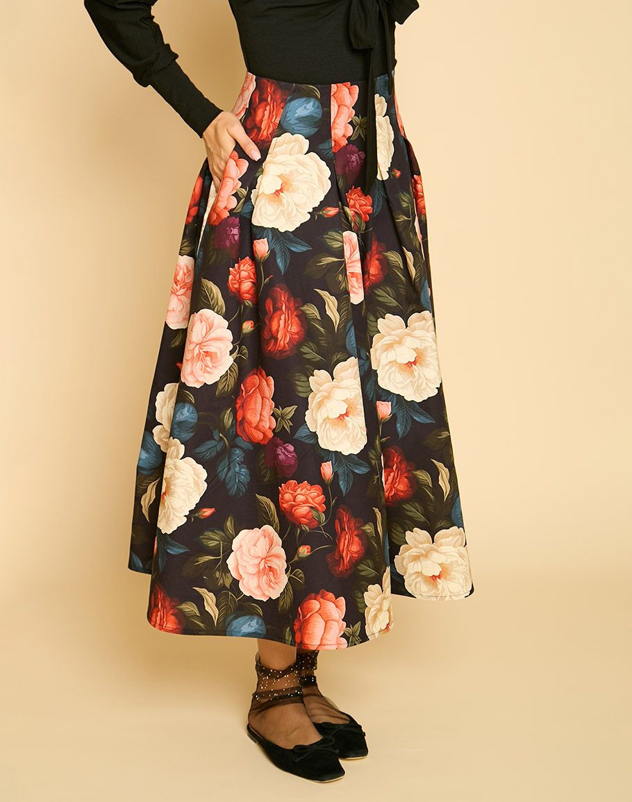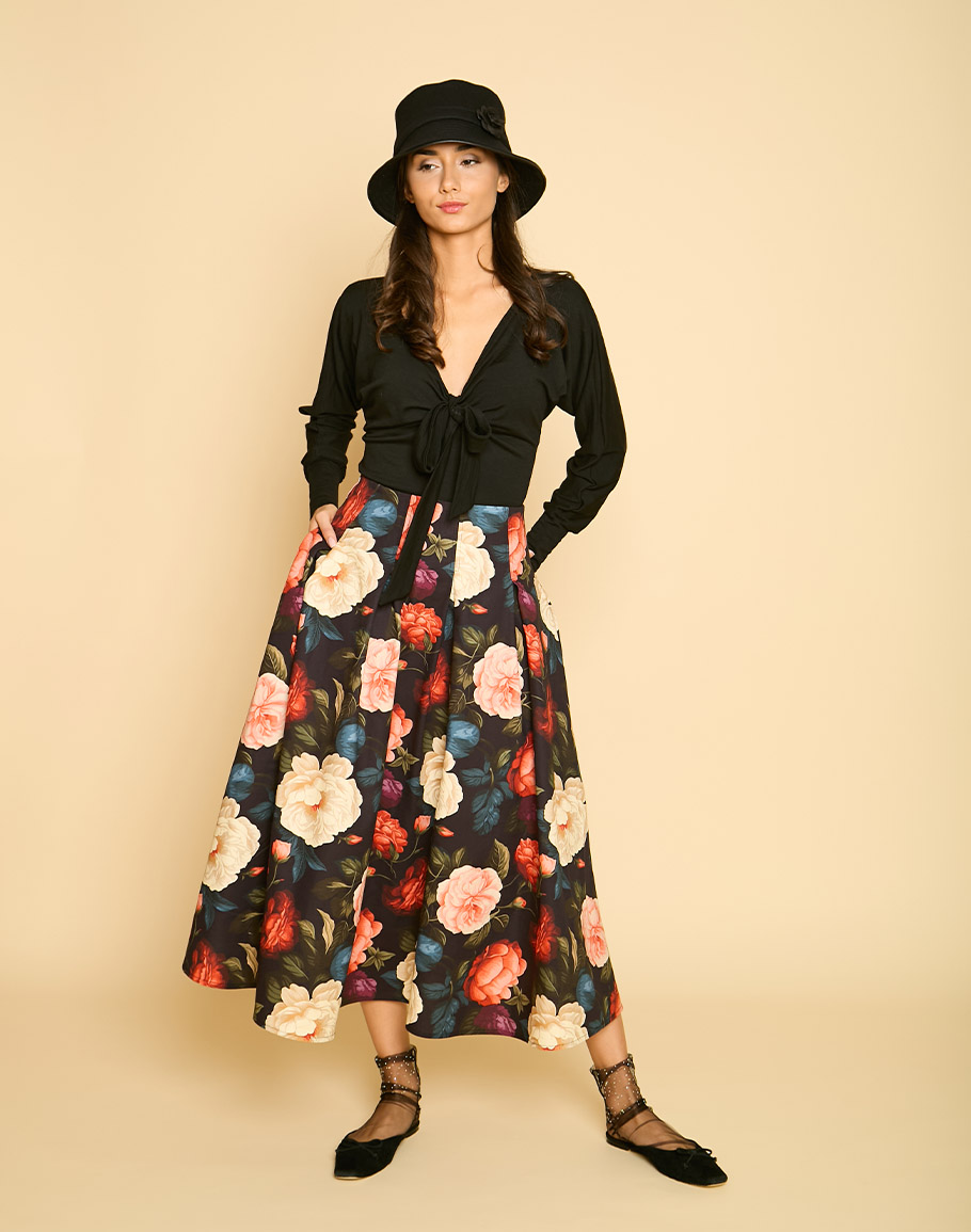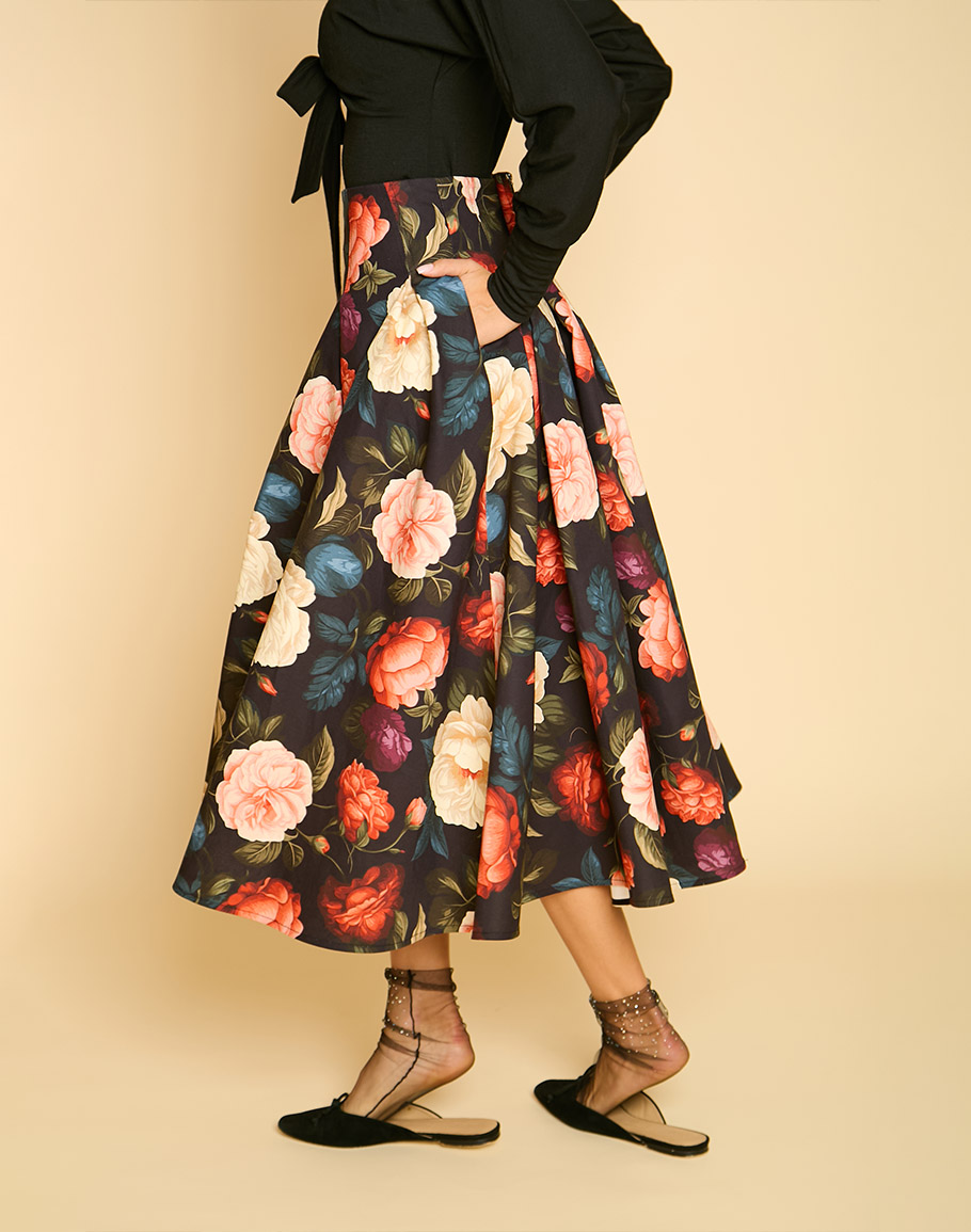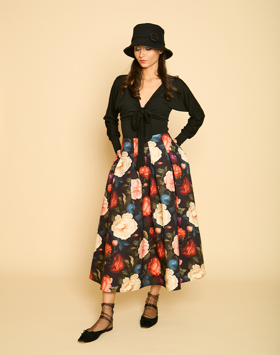 Пола MELANI FLOWERS в черен цвят покрита с нежен флорален десен. Елегантната флорална пола е прецизно моделирана както за комфорт, така и за стил. Полата е с басти в областта на талията и странични джобове в шев. Закопчава се с цип на гърба. Флоралната миди пола е изработена е от висококачествена материя, която запазва формата си и осигурява приятно усещане при носене. Подходяща е както за ежедневието, така и за по-специални поводи — полата се комбинира чудесно както с риза и токчета, така и с елегантен топ и сандали. Флоралната пола придава женственост и фин завършек на всяка визия. Дамската миди пола се предлага в размери S, M и L.