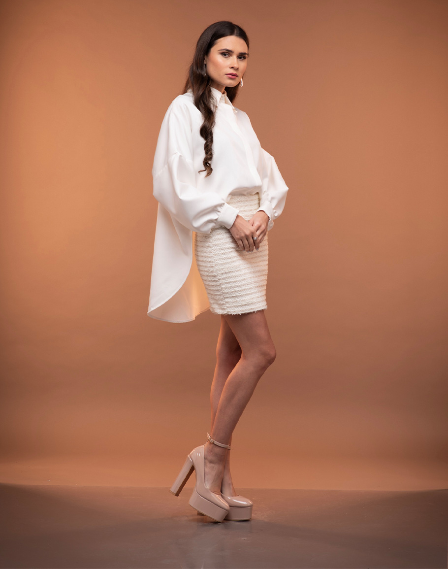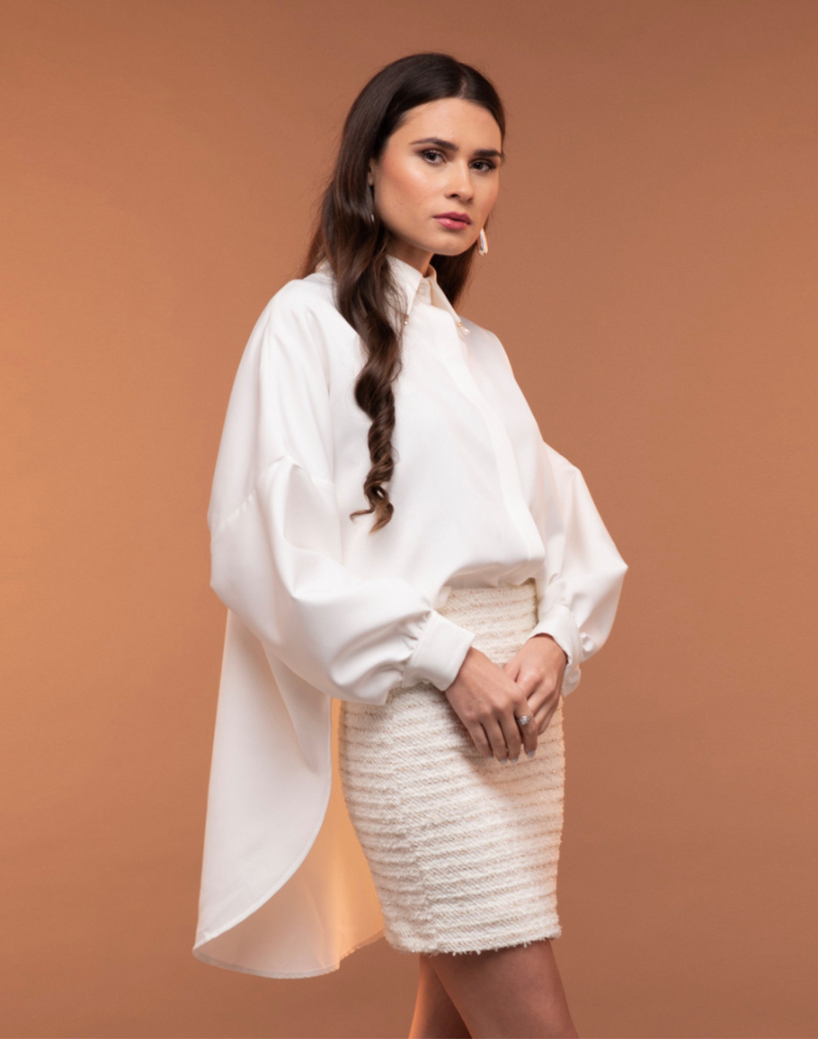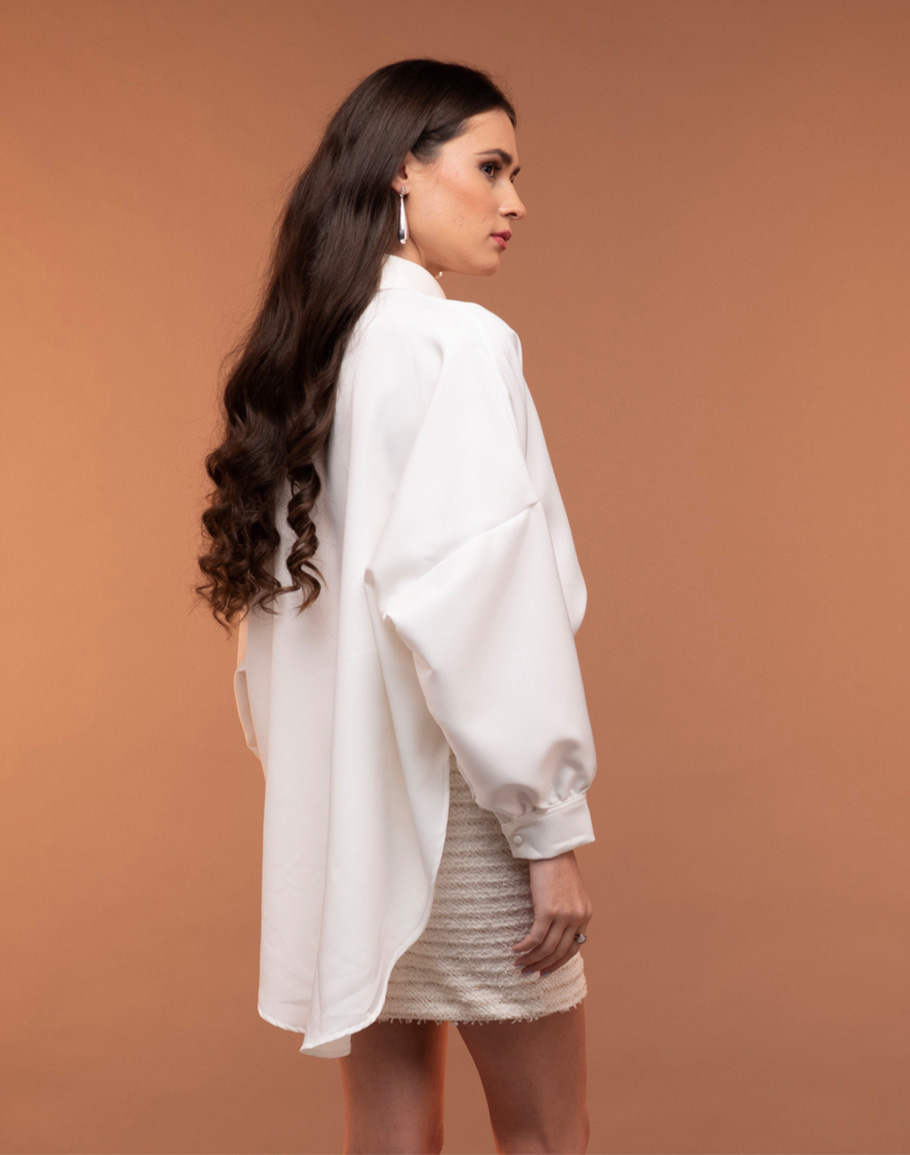 Риза MILA BIANCO в бял цвят с оувърсайз кройка е модерен и универсален елемент, който лесно се вписва във всеки гардероб. Супер качествената материя на бялата риза пада естествено и приятно по тялото, осигурявайки комфорт и лекота през целия ден. Свободният силует на бяла жоржетена риза придава актуална небрежна елегантност и позволява разнообразни стилни интерпретации. Ризата е изключително лесна за комбиниране – носи се еднакво добре с дънки, панталони, поли или като част от по-сложни слоеве. бялата риза е подходяща както за ежедневни визии, така и за по-елегантни съчетания, тя е перфектната основа за модерен, функционален и стилен аутфит с минимални усилия. Дамската бяла оувърсайз риза се предлага в размер One-size.